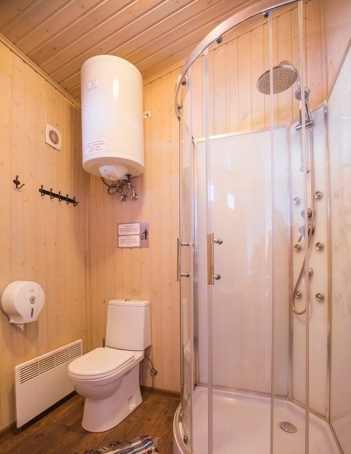 - внешний контрастный душ с видом на еловый лес;
