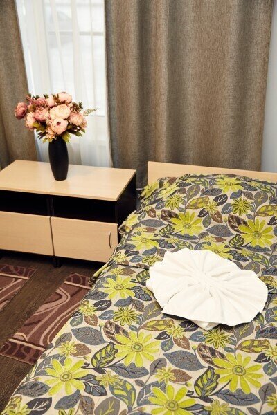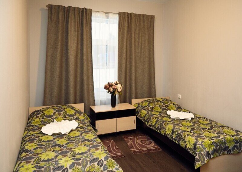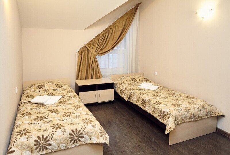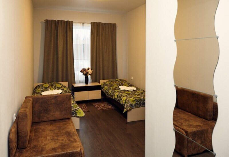 Оснащение номера: 2 стандартные раздельные кровати и доп. место диван, душ и туалет в номере, телевизор, тумбочка, табурет, стол, холодильник, настольная лампа, вешалка для одежды, зеркало, информационная папка для гостя.