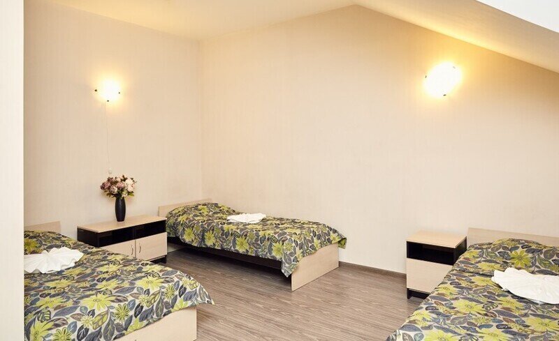 Оснащение номера: 4 стандартные раздельные кровати, душ и туалет в номере, телевизор, тумбочка, табурет, стол, холодильник, настольная лампа, вешалка для одежды, зеркало, информационная папка для гостя.