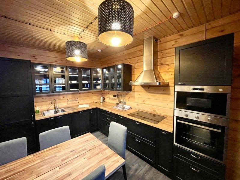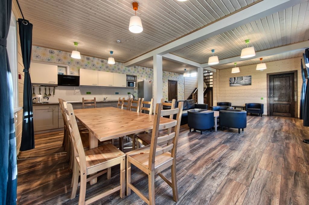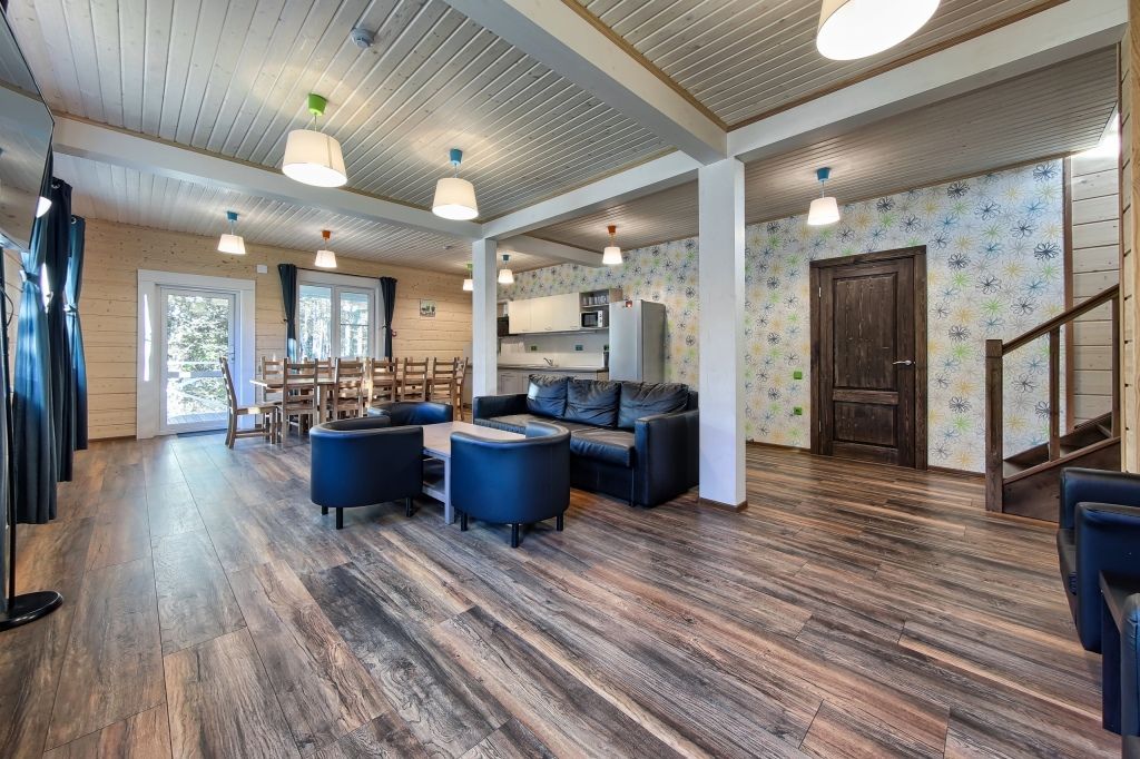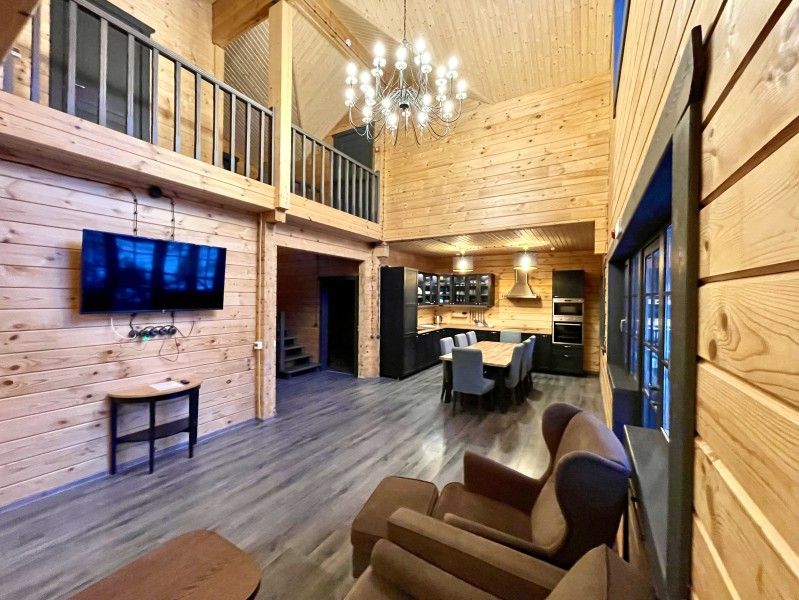 Двухэтажный коттедж с 5 спальнями и дровяной сауной. Первый этаж коттеджа состоит из прихожей, кухни-гостиной, ванной комнаты, которая включает в себя 2 раздельных туалета, 2 раковины, душевая комната с двумя душами, дровяную сауну и одну спальню. На втором этаже четыре спальни, два санузла, зона для отдыха с пуфами. Коттедж оборудован холодильником, варочной панелью, посудомоечной машиной, микроволновой печью, чайником, комплектом посуды, феном, стиральной машиной, всей необходимой мебелью, мангалом. Общая площадь коттеджа 205 м.кв.