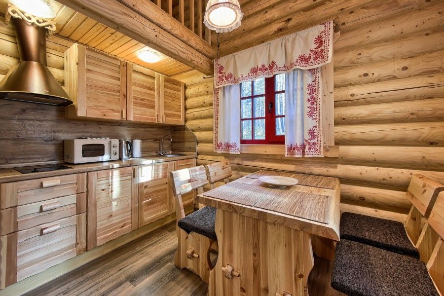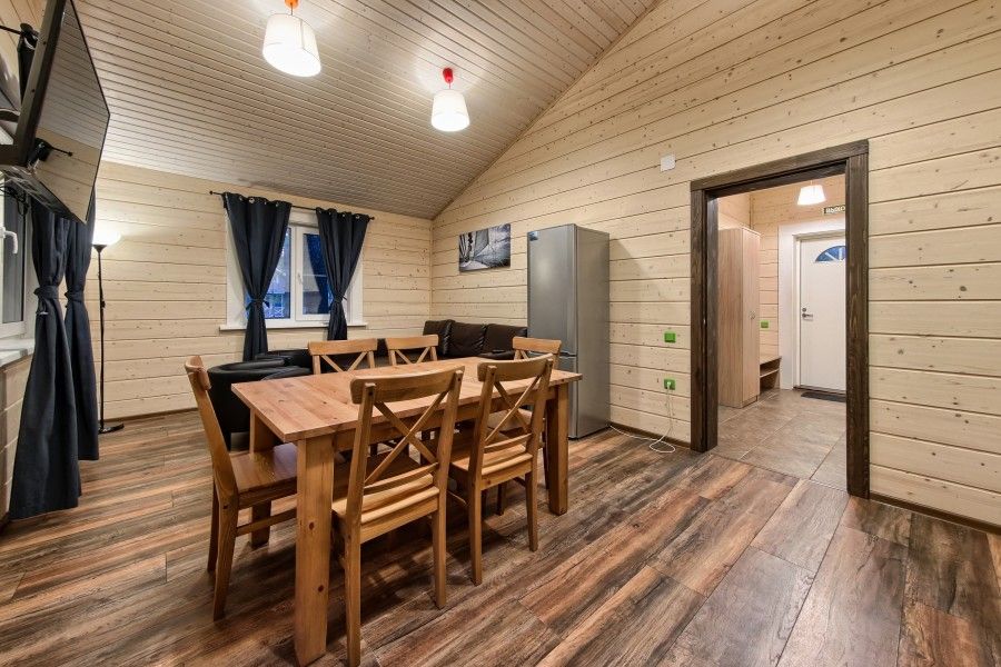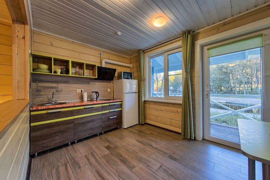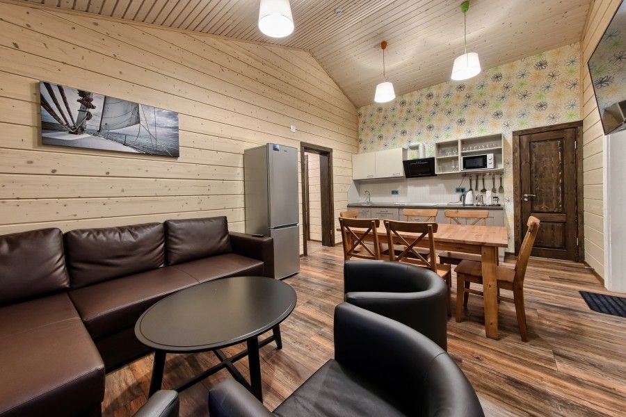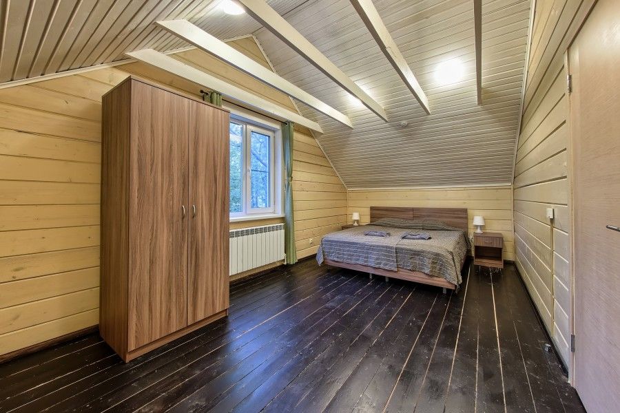 Уютный деревянный коттедж в Карельском стиле. Домики расположены в глубине леса на сосновой аллее. Терраса с зоной барбекю. На первом этаже гостиная зона с раскладывающимся диваном, кухня, ТВ, журнальным столиком, шкафом. На кухне есть все необходимое: холодильник, варочная поверхность, микроволновая печь, электрический чайник, вся необходимая посуда. Второй этаж — это просторная уютная мансарда с двумя односпальными кроватями. Площадь дома 40 кв.м.