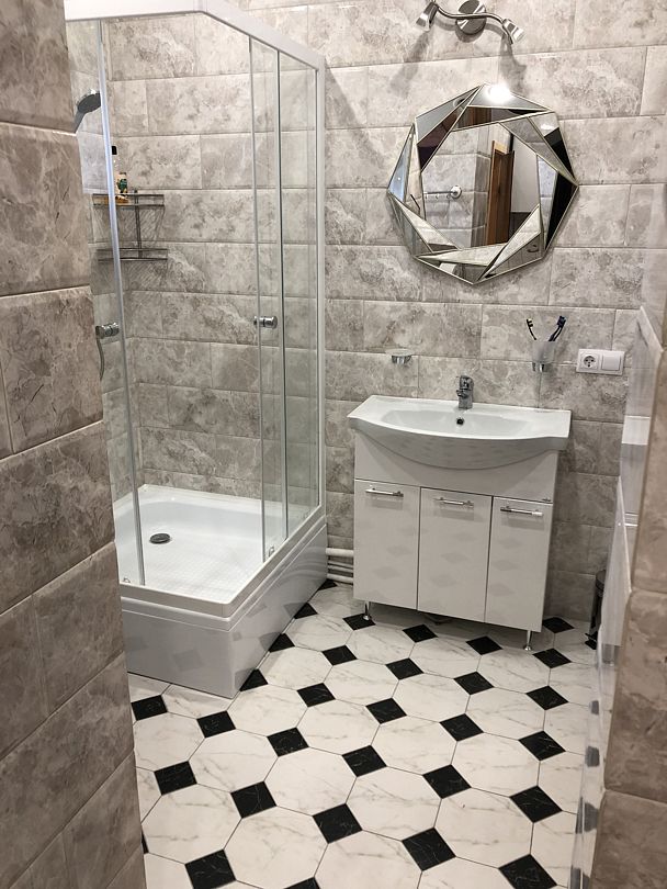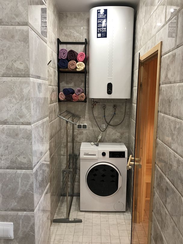 Санузел с выделенной зоной для стирки и сауной.
