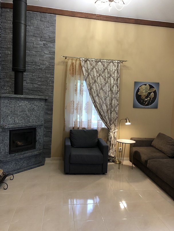 В гостиной высокие потолки 4,5 м и камин из натурального карельского камня, уютная обеденная зона. Есть кресло-кровать с дополнительным спальным местом. Телевизор с диагональю 55 дюймов и Смарт ТВ с Алисой. телевидением.