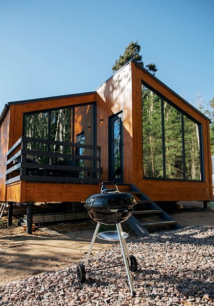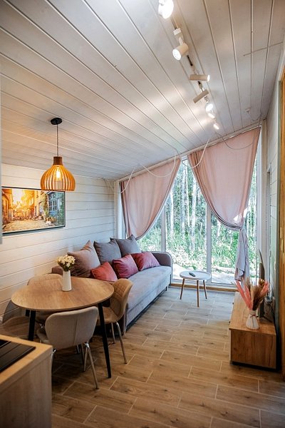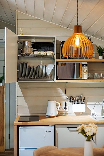 Коттедж с двумя спальнями, кухней-гостиной и открытой верандой, где можно посидеть на свежем воздухе. Есть все удобства для комфортного проживания и отдыха.