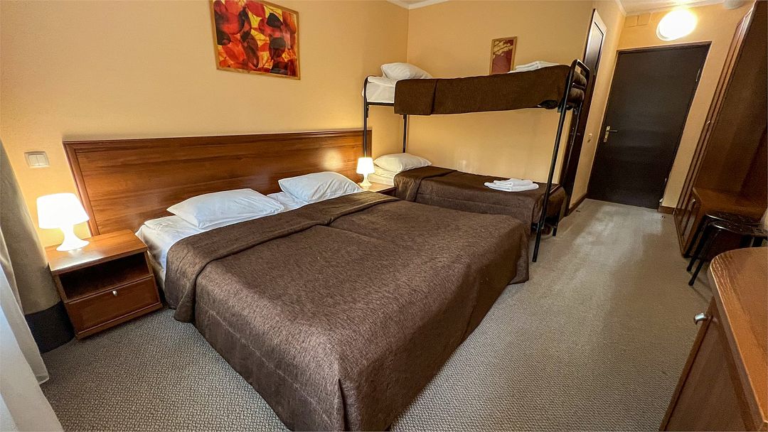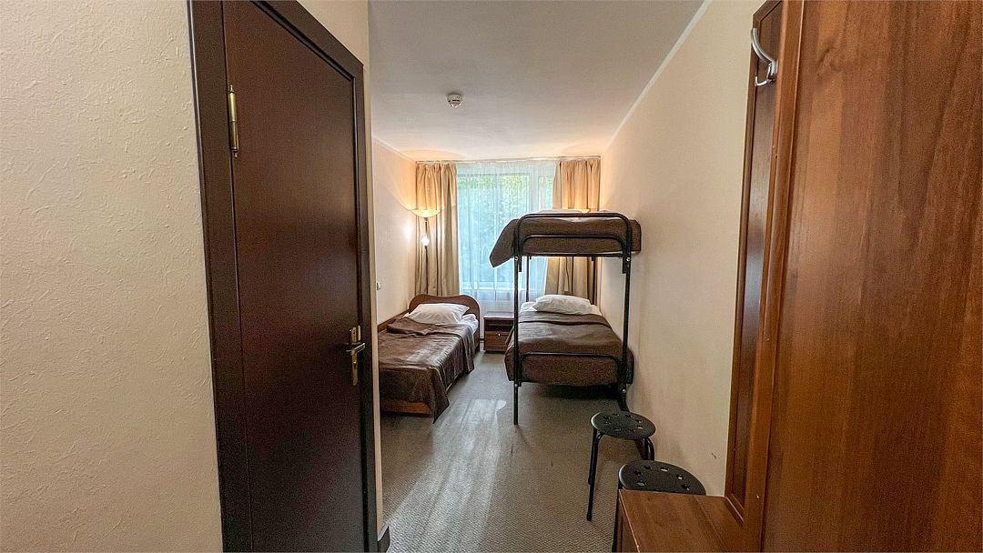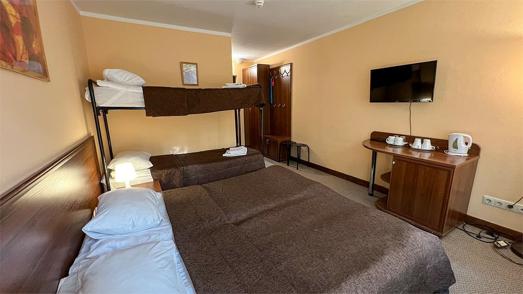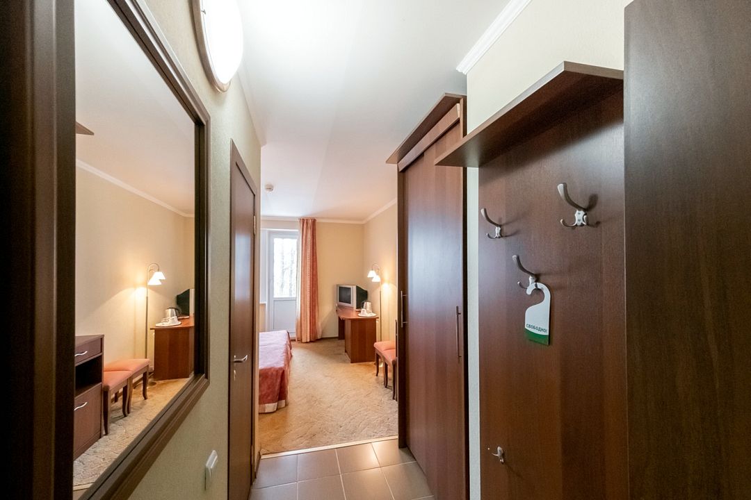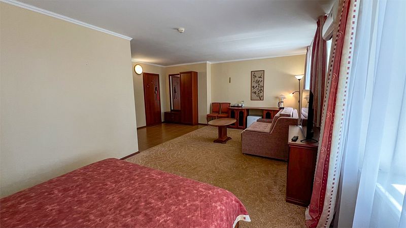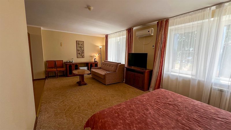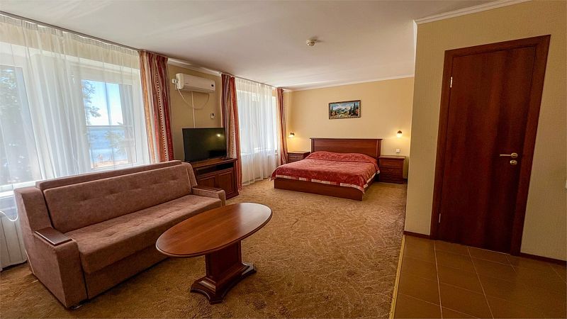 Для путешествующих компанией из трех человек отлично подойдет номер категории полулюкс, которые расположены во 2, 4 и 5 корпусах. В номере одна большая кровать, в некоторых есть диван, который может служить дополнительным спальным местом для одного человека. За счет большой площади номера (27 кв.м.) он разделен на три зоны: прихожая, с тумбочкой для обуви и вешалкой для одежды, гостиная, с раскладным диваном, журнальным столиком и мягкими стульями и спальня. Комната оборудована чайником, холодильником, телевизором, а отдельная ванная комната - ванной и феном. Халаты и полотенца предоставляются бесплатно в номерах данной категории.