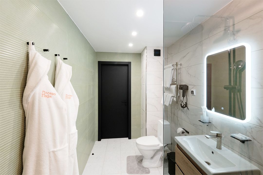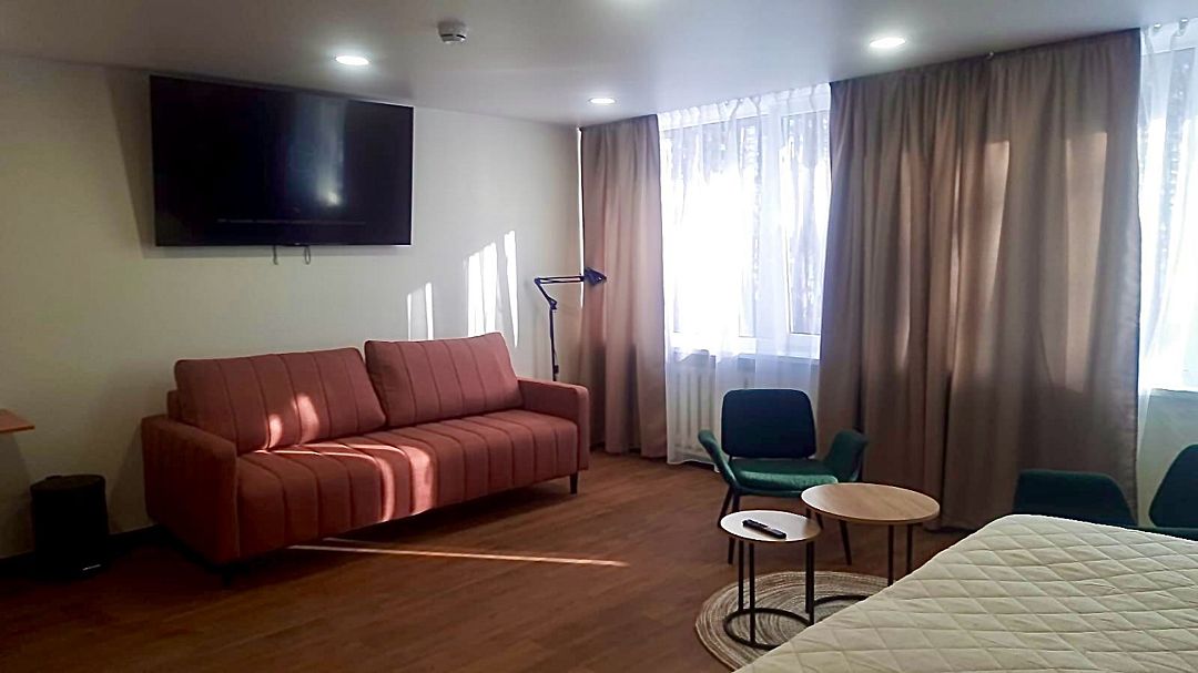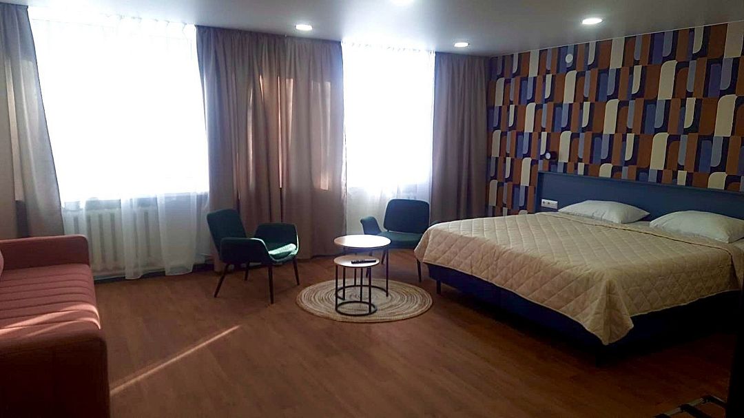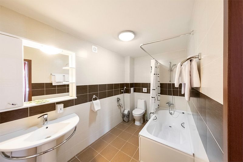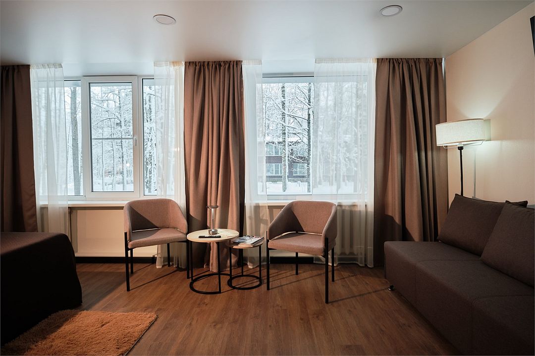 Для путешествующих компанией из трех человек отлично подойдет номер категории полулюкс, которые расположены во 2, 4 и 5 корпусах. В номере одна большая кровать, в некоторых есть диван, который может служить дополнительным спальным местом для одного человека. За счет большой площади номера (27 кв.м.) он разделен на три зоны: прихожая, с тумбочкой для обуви и вешалкой для одежды, гостиная, с раскладным диваном, журнальным столиком и мягкими стульями и спальня. Комната оборудована чайником, холодильником, телевизором, а отдельная ванная комната - ванной и феном. Халаты и полотенца предоставляются бесплатно в номерах данной категории.