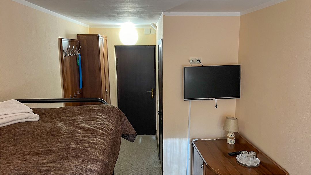 Не выбраноДостоинстваЗаказывали номер через бронирование день в день. Приехали с собакой, заселили без проблем. Номер хоть и небольшой, есть душ, туалет, холодильник, телевизор. Завтрак входит в оплату. Все понравилось.
