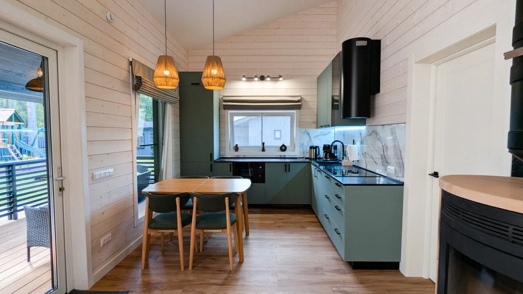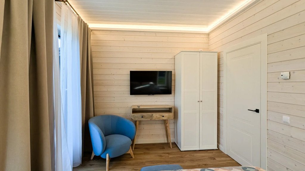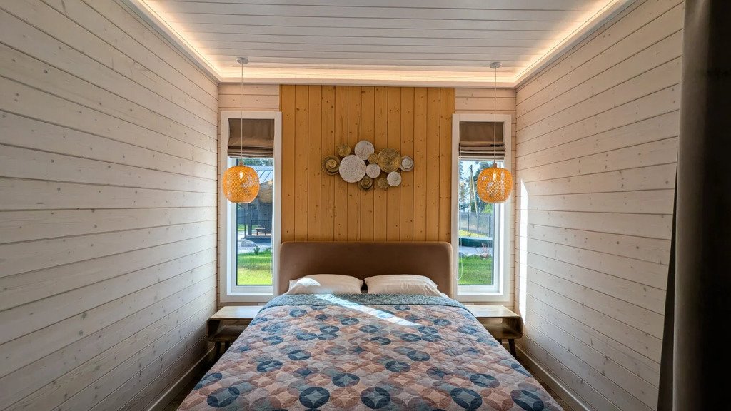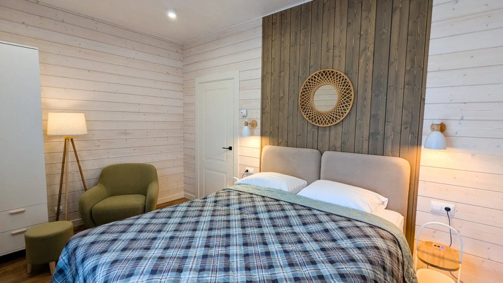 В доме есть необходимое для отдыха: кухня-гостиная с техникой: холодильник, варочная панель, посудомоечная машина, микроволновая печь, чайник, кофеварка, набор посуды, стиральная машина; 2 спальни с двуспальными кроватями и раскладной диван, санузел с душевой и сауной, выход на террасу с видом на озеро, камин, спутниковое ТВ, Wi-Fi, тёплые полы; постельное бельё и полотенца включены в стоимость.