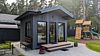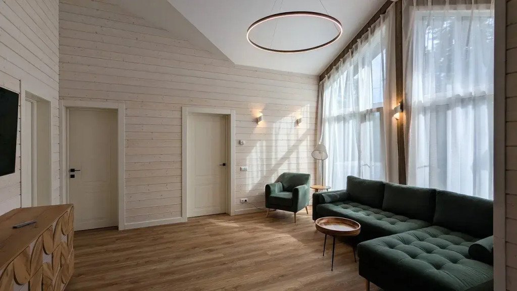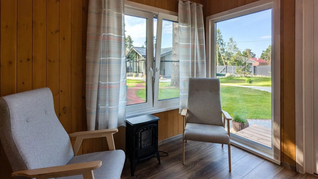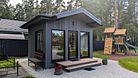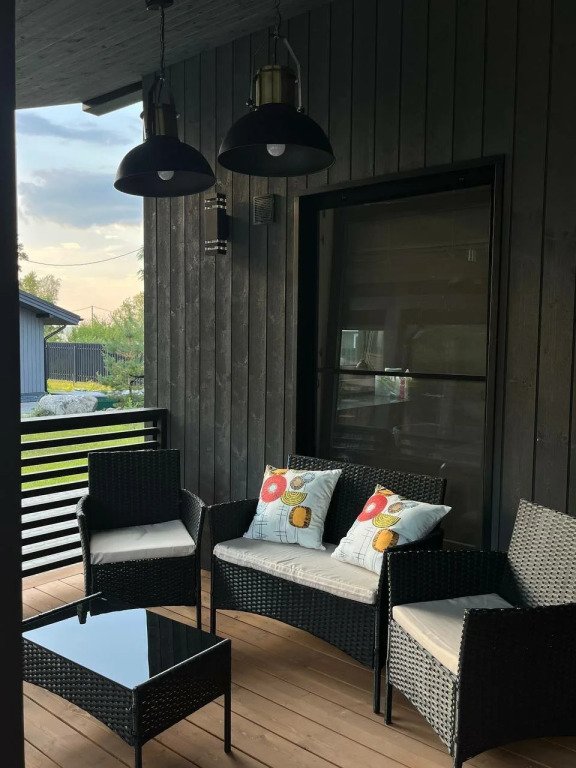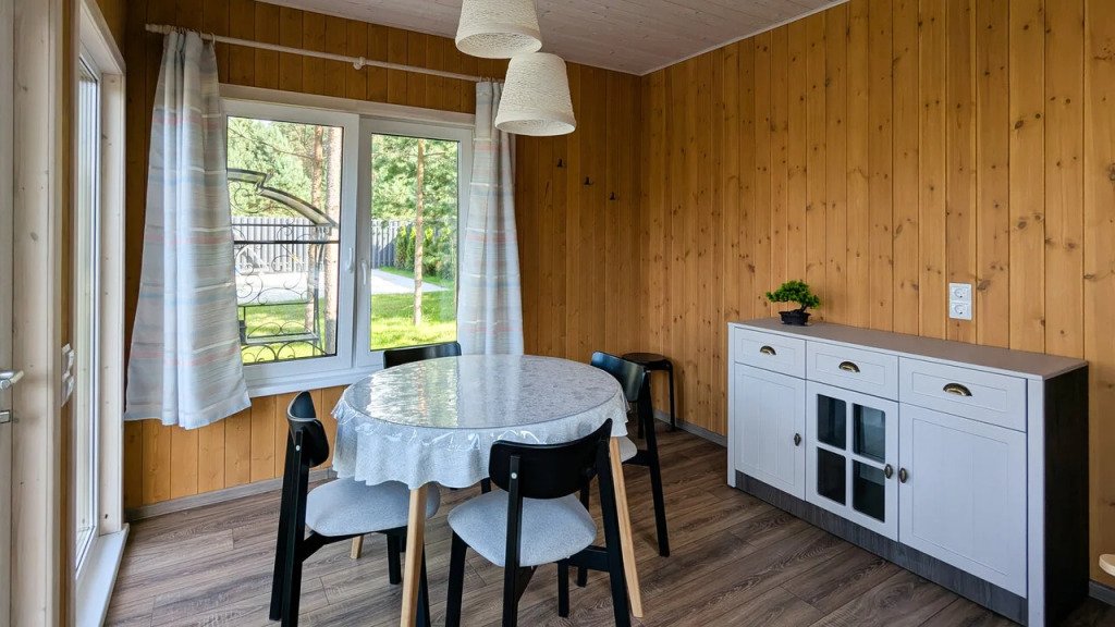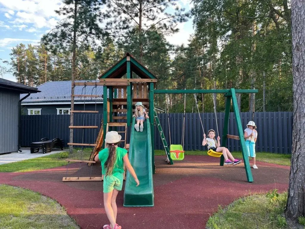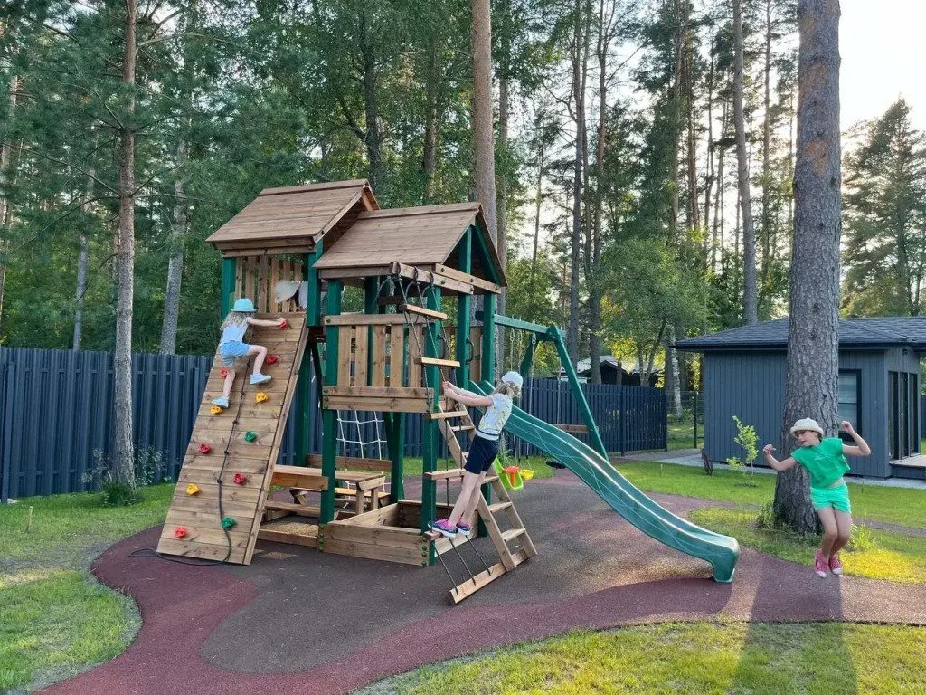 Дом с панорамным остеклением, мебелью, собственной беседкой с зоной барбекю, ландшафтным дизайном и детской площадкой. Подходит для отдыха на природе в кругу семьи или друзей. Вместимость дома — до 6 гостей.