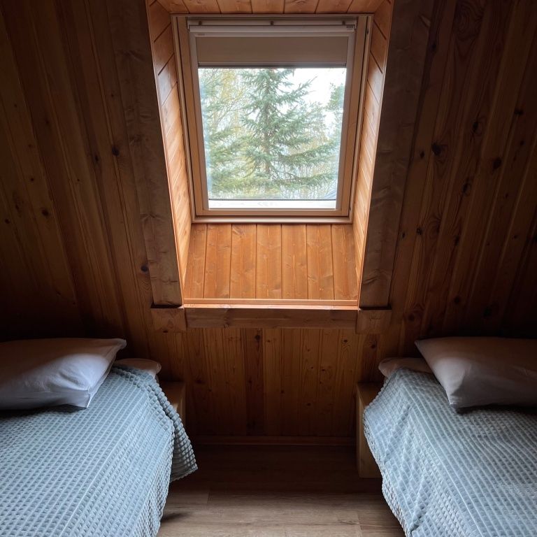 На втором этаже стоят две односпальные кровати, телевизор и шкаф.