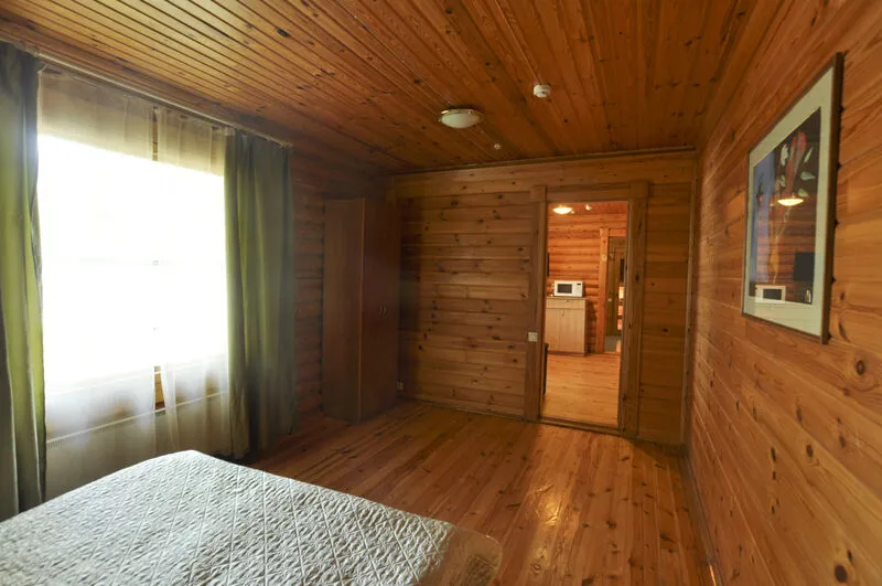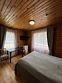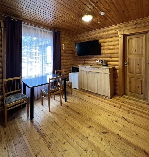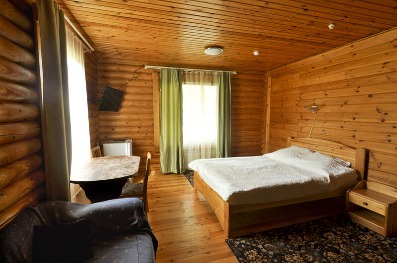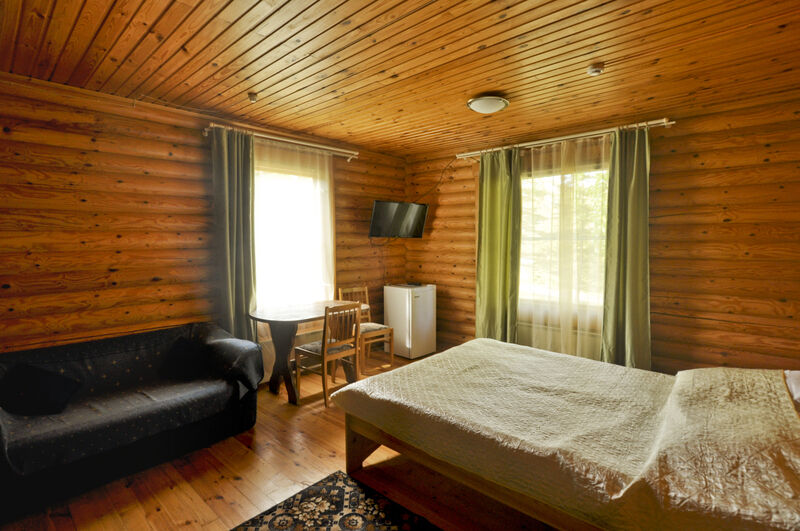 Номер расположен на первом этаже второго корпуса. В гостиной стоит удобный диван, обеденный стол, холодильник, микроволновая печь, телевизор, электрический чайник и комплект посуды (тарелки, чашки, стаканы, столовые приборы). В спальне - двухспальная кровать и шкаф.