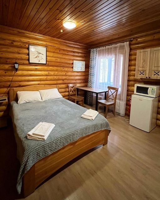 В комнате стоит удобная двухспальная кровать, холодильник, микроволновая печь. Также в номере есть электрический чайник и комплект посуды (тарелки, чашки, стаканы, столовые приборы).