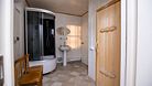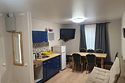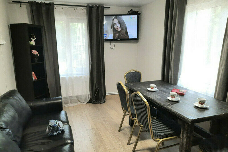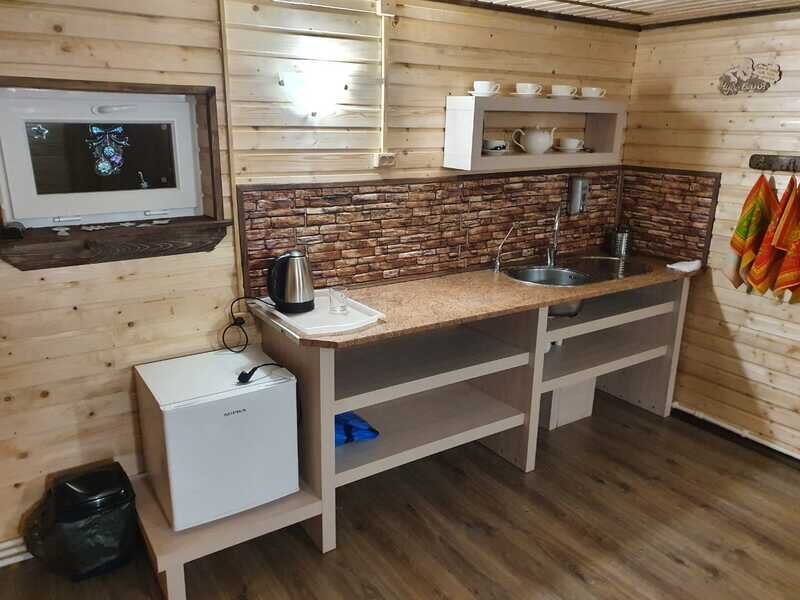 Удобства внутри дома - душевая кабина и санузел. В просторной гостиной мини-кухня без плиты, оснащенная современным холодильником и микроволновкой, а также обеденная зона, мягкий диван и телевизор для вашего комфорта и развлечений.