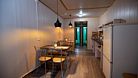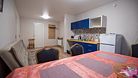 Двухэтажное здание, в котором находится зона гостиной с удобными диванами и столами, мини-кухня с плитой, холодильником и микроволновкой.