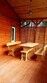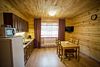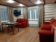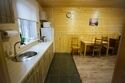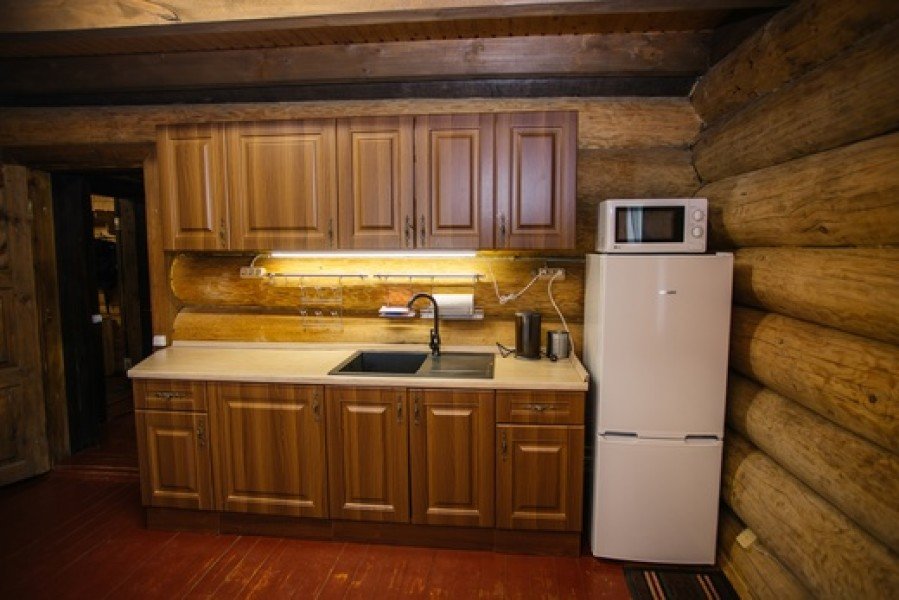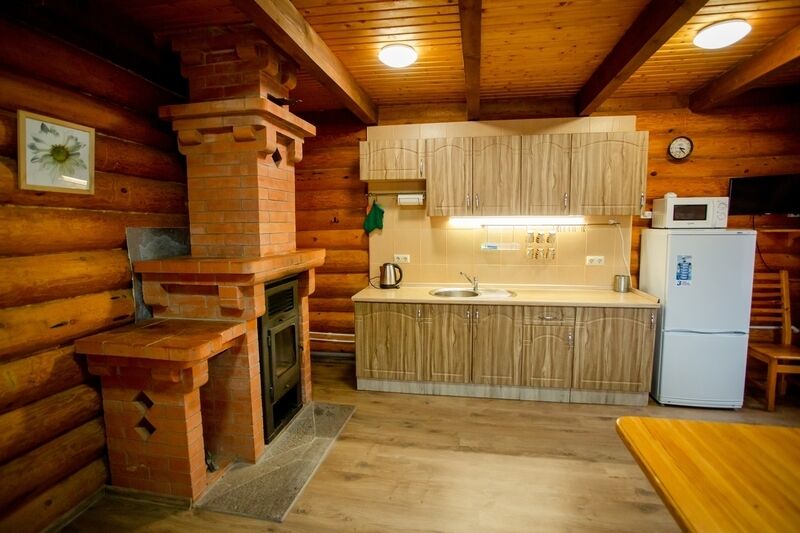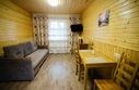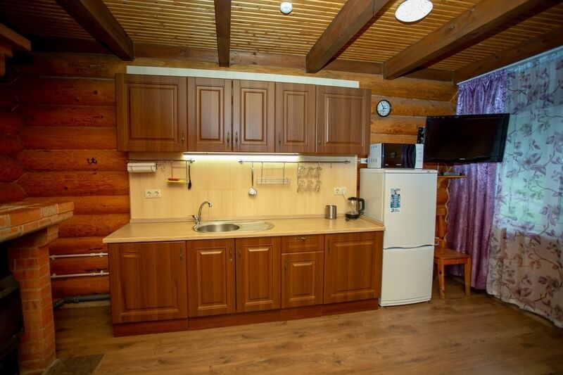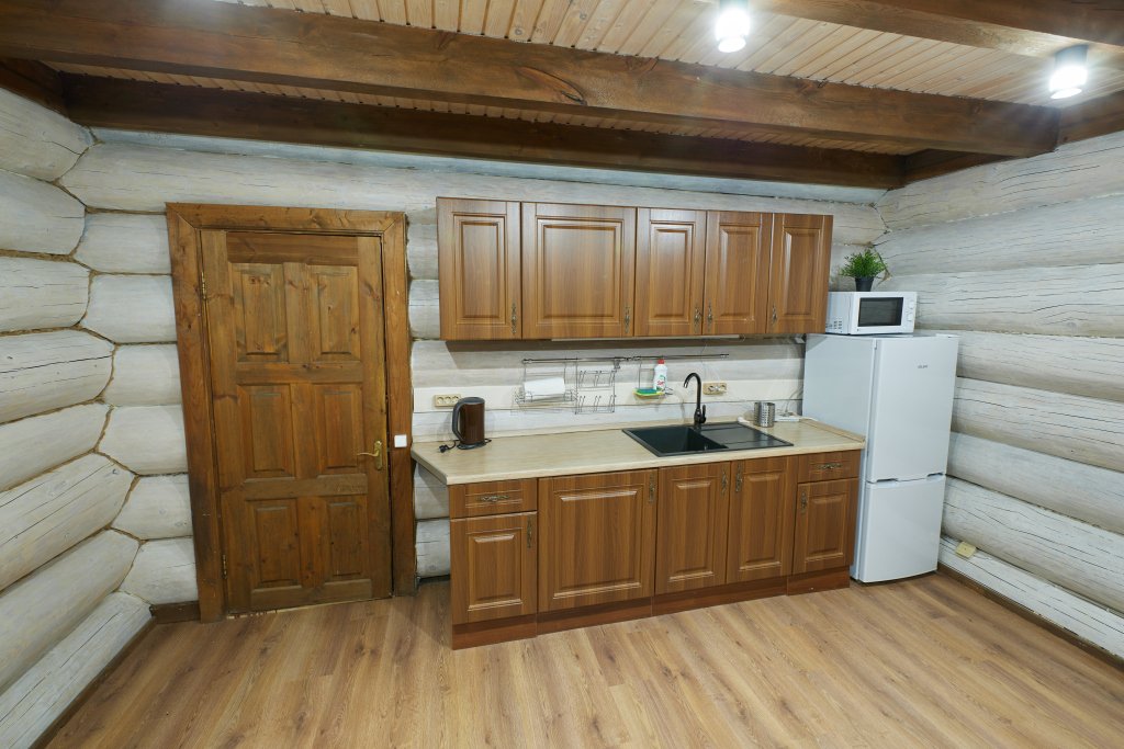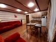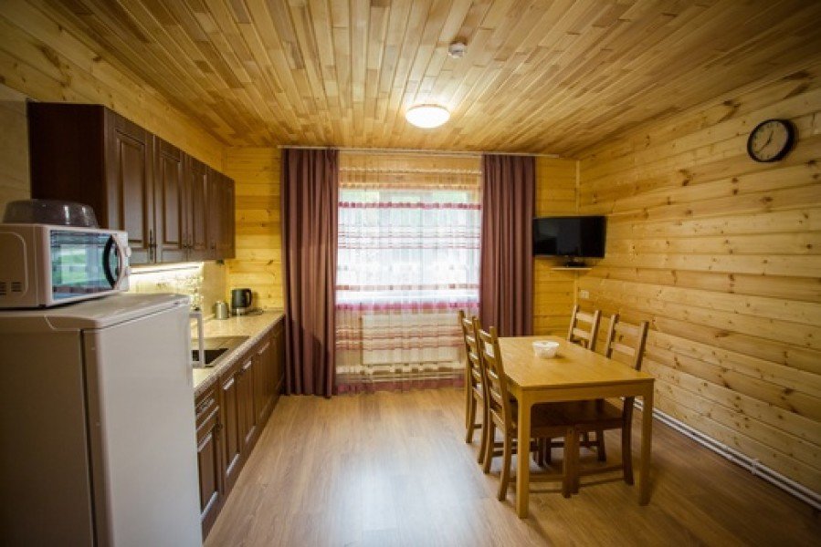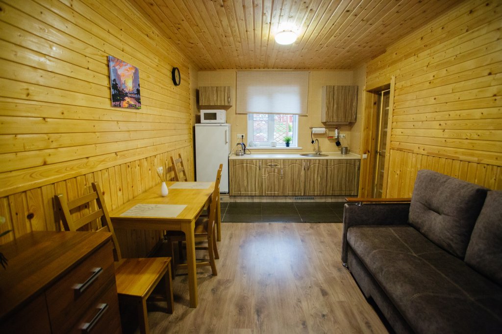 Кухня-гостиная с раскладным диваном, обеденным столом, камином, спутниковым TV. Есть холодильник, микроволновка, электрический чайник.