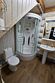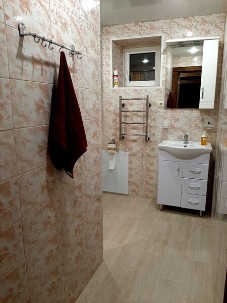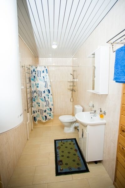 1 этаж. Спальня с тремя односпальными кроватями. Гостиная с двуспальным раскладным диваном, телевизором и мини-кухней (холодильник, микроволновка, электрический чайник). Санузел с душевой кабиной, туалетом, раковиной.