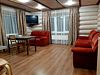 Гостиная с раскладным диваном, мини-кухней (холодильник, микроволновка, электрический чайник), столом и спутниковым TV.