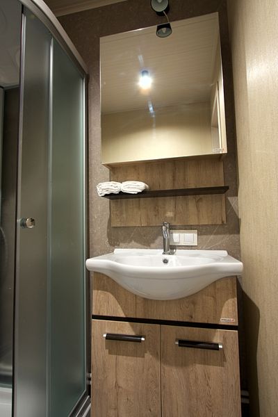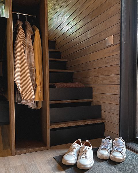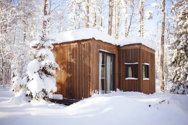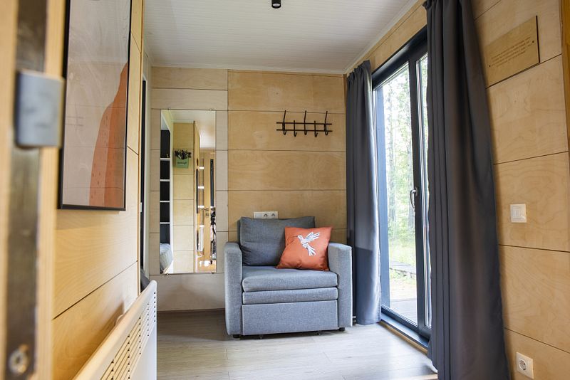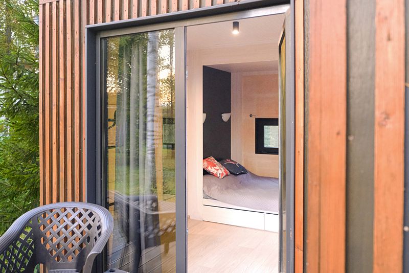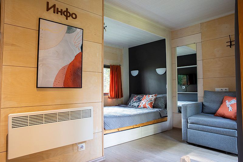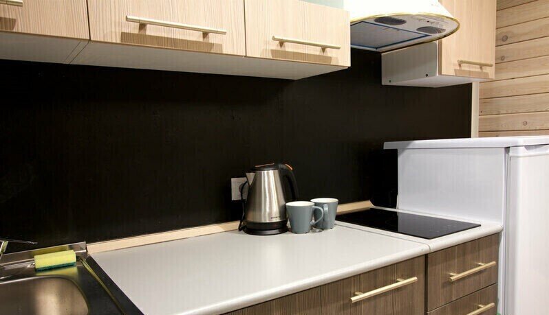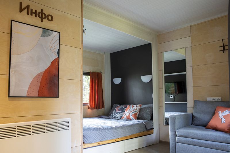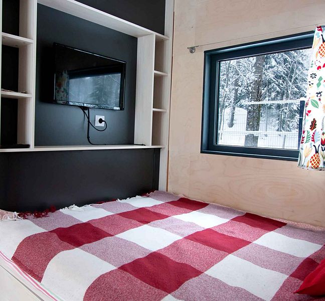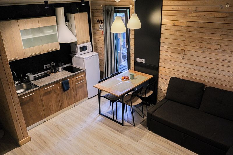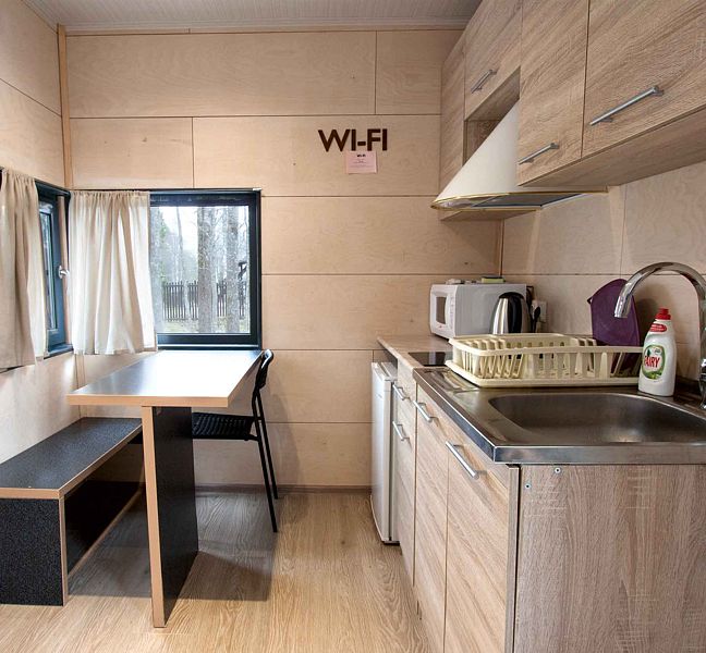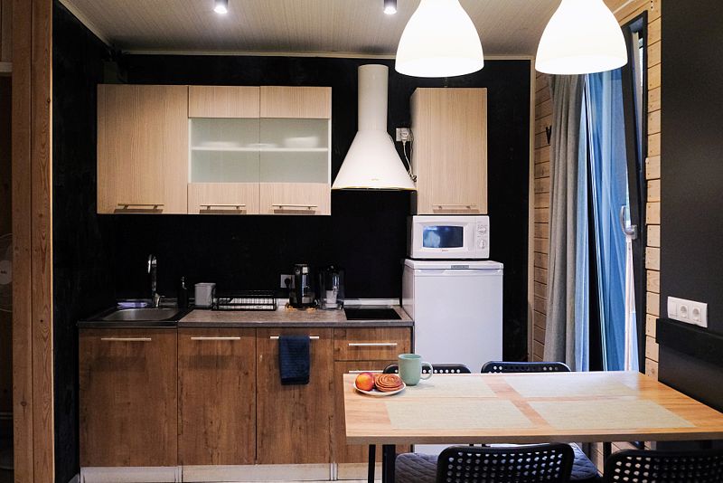 Несмотря на кажущийся с виду небольшой размер домика, в нем есть все необходимое даже для длительного пребывания: собственная кухня с плитой и холодильником, душ, удобная кровать, стол для приема пищи, комната для сушки лыж, системы хранения вещей.