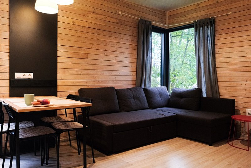 К вашим услугам будут комфортная двуспальная кровать, раскладывающийся диван, собственная кухня, душ, место для хранения и сушки лыж, чистый лесной воздух, а также атмосфера уюта и загородного отдыха.