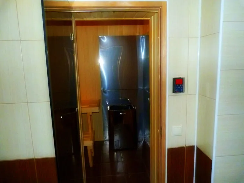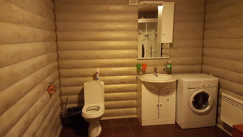 - Ванная комната, оснащенная финской сауной, душевой кабиной, санузлом, раковиной, теплым полом и стиральной машиной.
