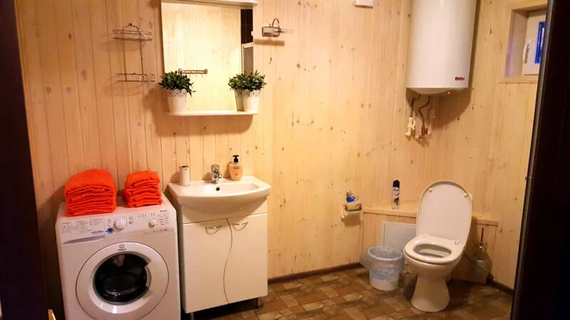 - Ванная комната, оснащенная душевой кабиной, бойлером, санузлом, раковиной и стиральной машиной.