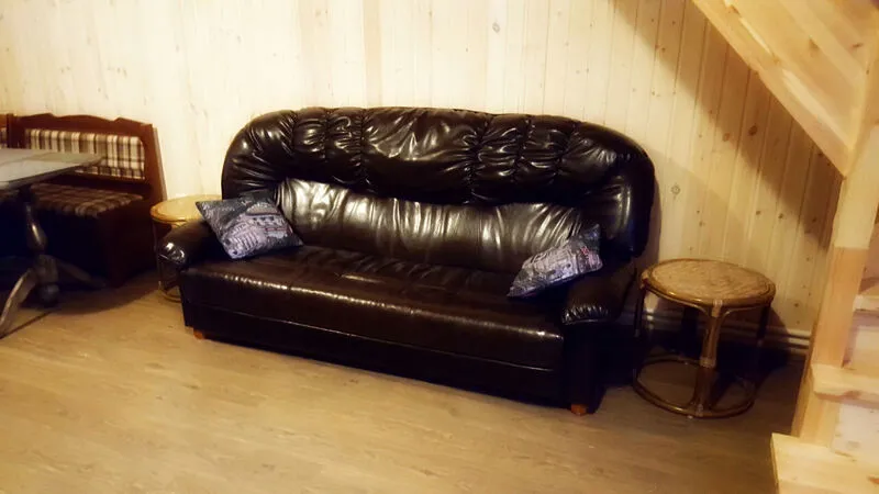 - В гостиной расположены уютный кожаный диван с креслом и телевизор