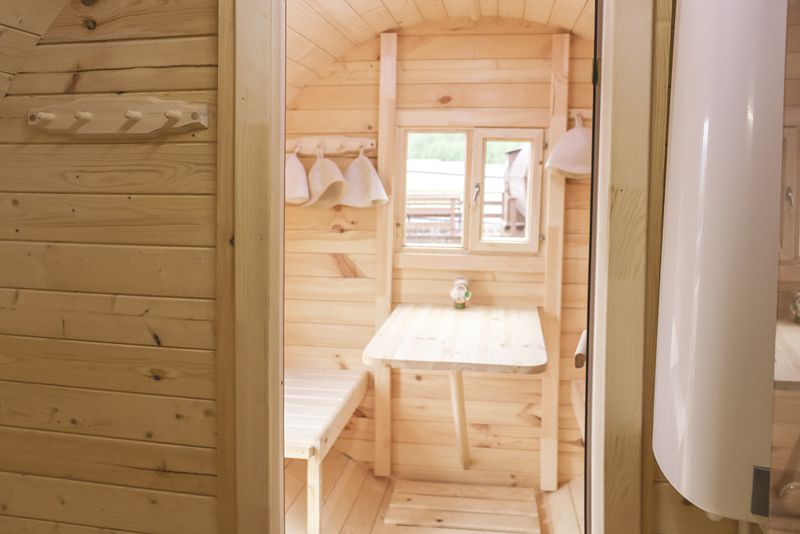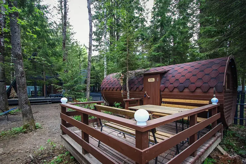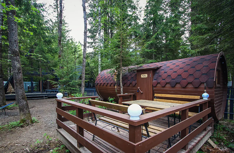 К услугам гостей доступна баня-бочка — в этом теплом месте отдыха оборудованы датчики движения, температуры, система управления движением и нагрузкой. С помощью специальных камней гости смогут создавать пар.