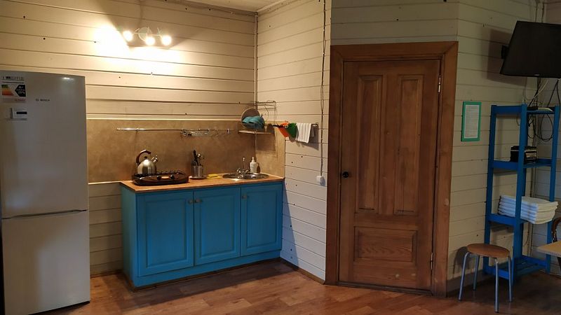 - Кухня (плита, холодильник, раковина, микроволновка, чайник, полный комплект посуды)