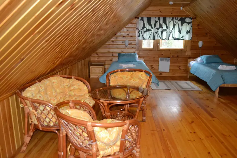 Две спальни: 4 раздельные кровати, 1 двуспальная кровать. Оборудованная кухня, камин. Электрический чайник, посуда, холодильник Телевизор, фен. Душ, санузел, сауна. 2 парковочных места для автомобиля Сезонный спортивный инвентарь Завтрак с 9:30 до 12:00, Посещение бассейна без ограничения (в часы работы) Мангал, беседка для шашлыков.