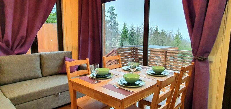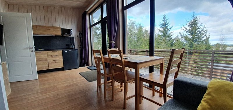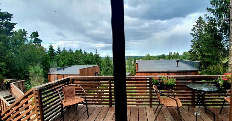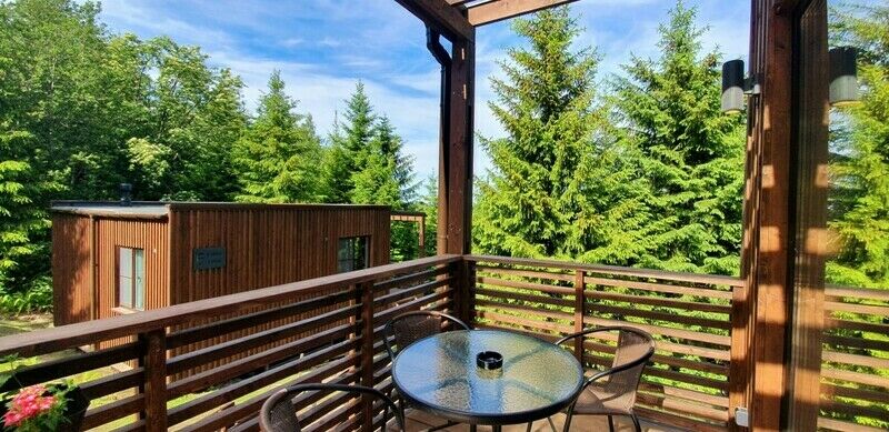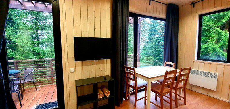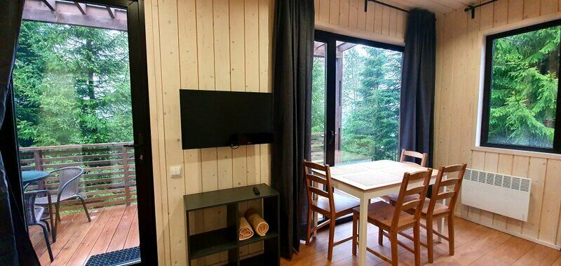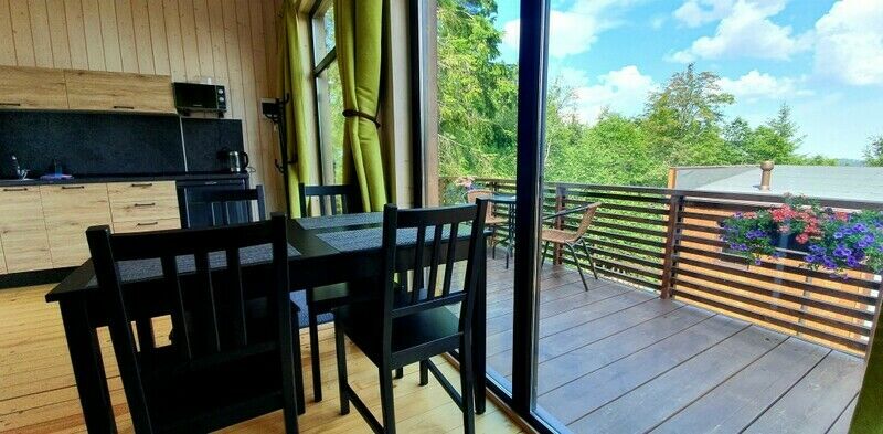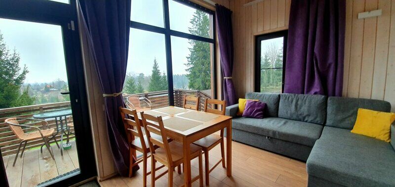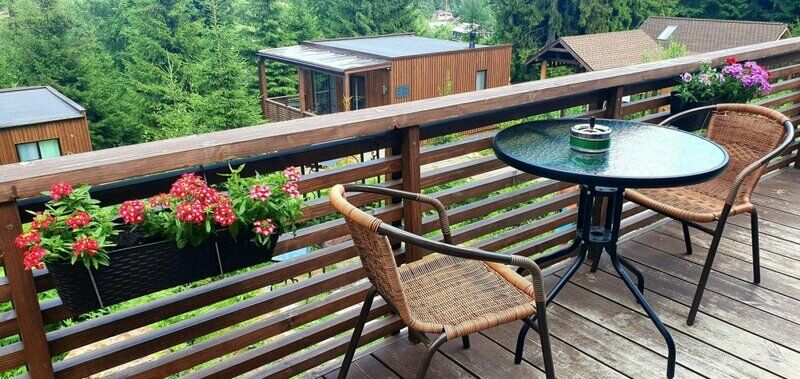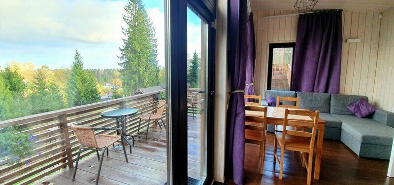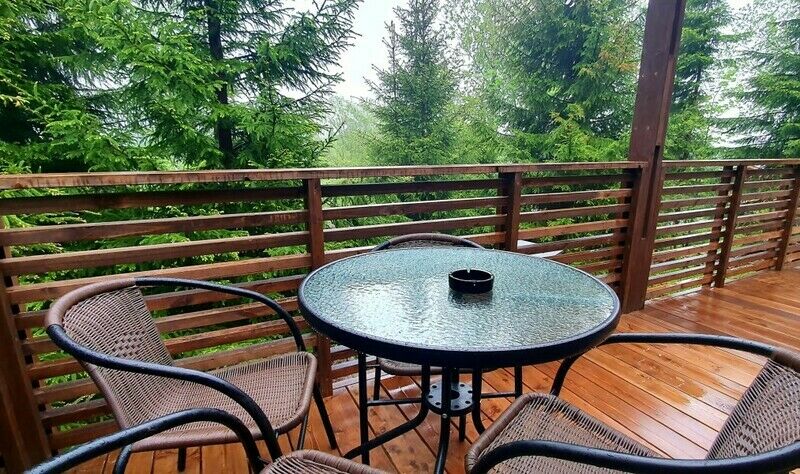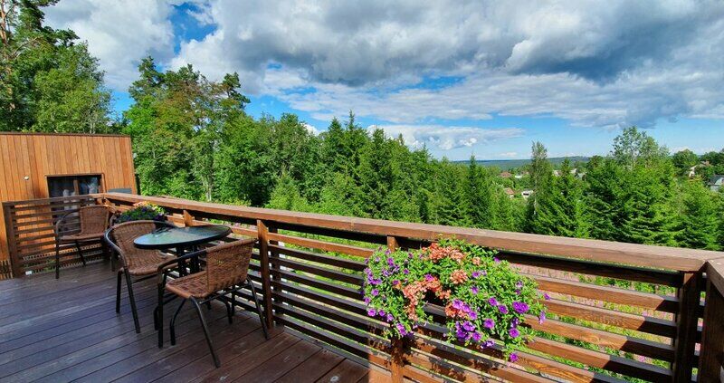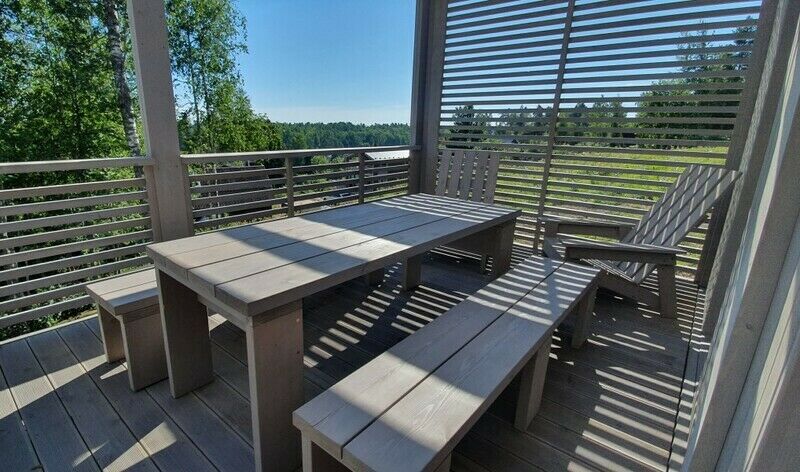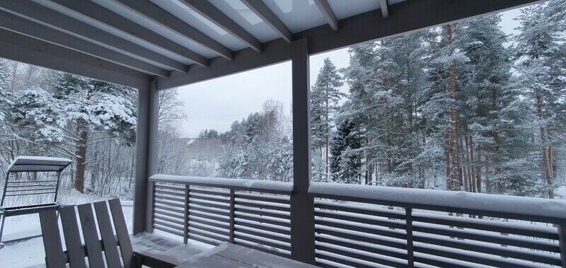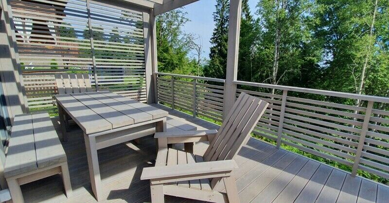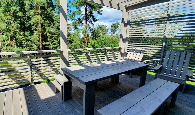 Крытая терраса с потрясающим видом на сосновый лес с террасной мебелью (стол 80*200, скамейки 2 шт. + уличные кресла кресла 2 шт.).