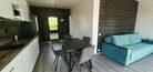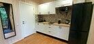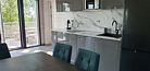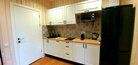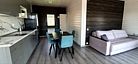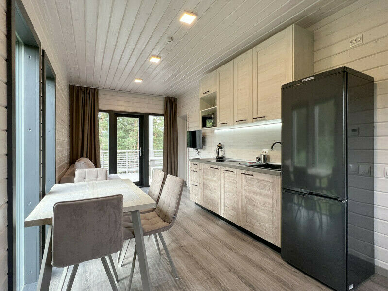 Полноценная кухня со всем необходимым внутри, раскладной обеденный стол 120(140) *80, двухкамерный холодильник с морозильной камерой, двухкомфорочная электрическая плита, микроволновая печь, чайник, посудомоечная машина.