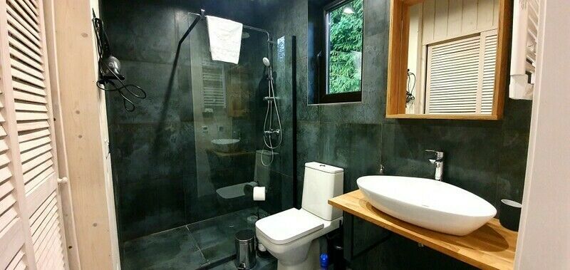 - банный набор ( халаты, полотенца, банные шапочки, простыни, удобные тапочки, гель для душа, шампунь, косметика ручной работы, фен).