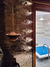 - банное пространство: парная из сибирского кедра, печь: верхняя часть печи состоит из малинового кварцита, нижняя часть из жадеита;