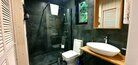 Совмещенный санузел (раковина, унитаз, большая стеклянная душевая кабина), фен.