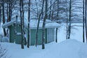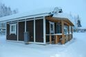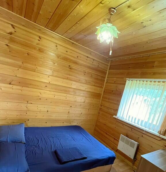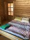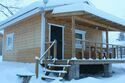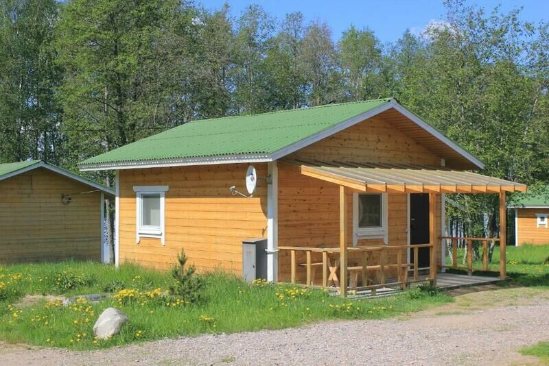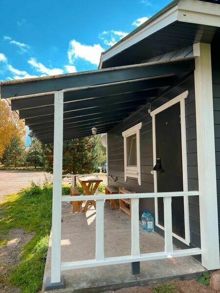 Веранда на крыльце, вход по ступенькам. Две изолированные спальни, в каждой по двуспальной кровати, диван в кухне - гостиной.