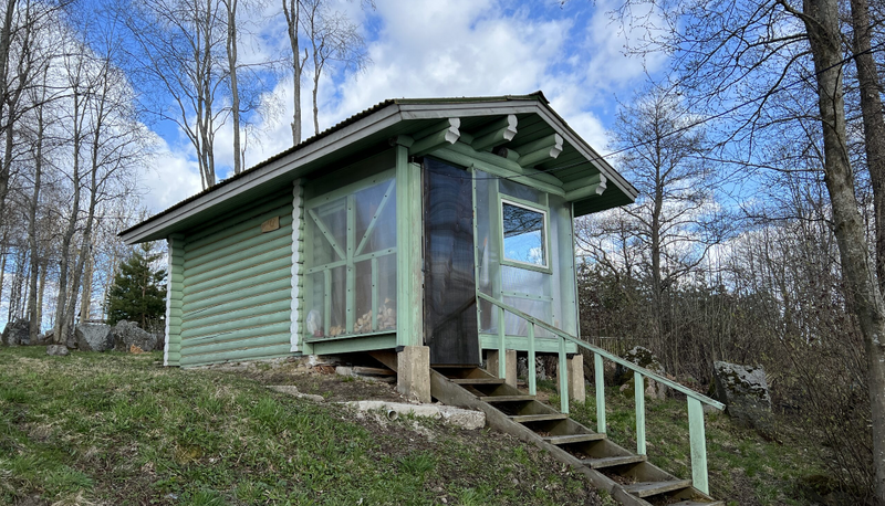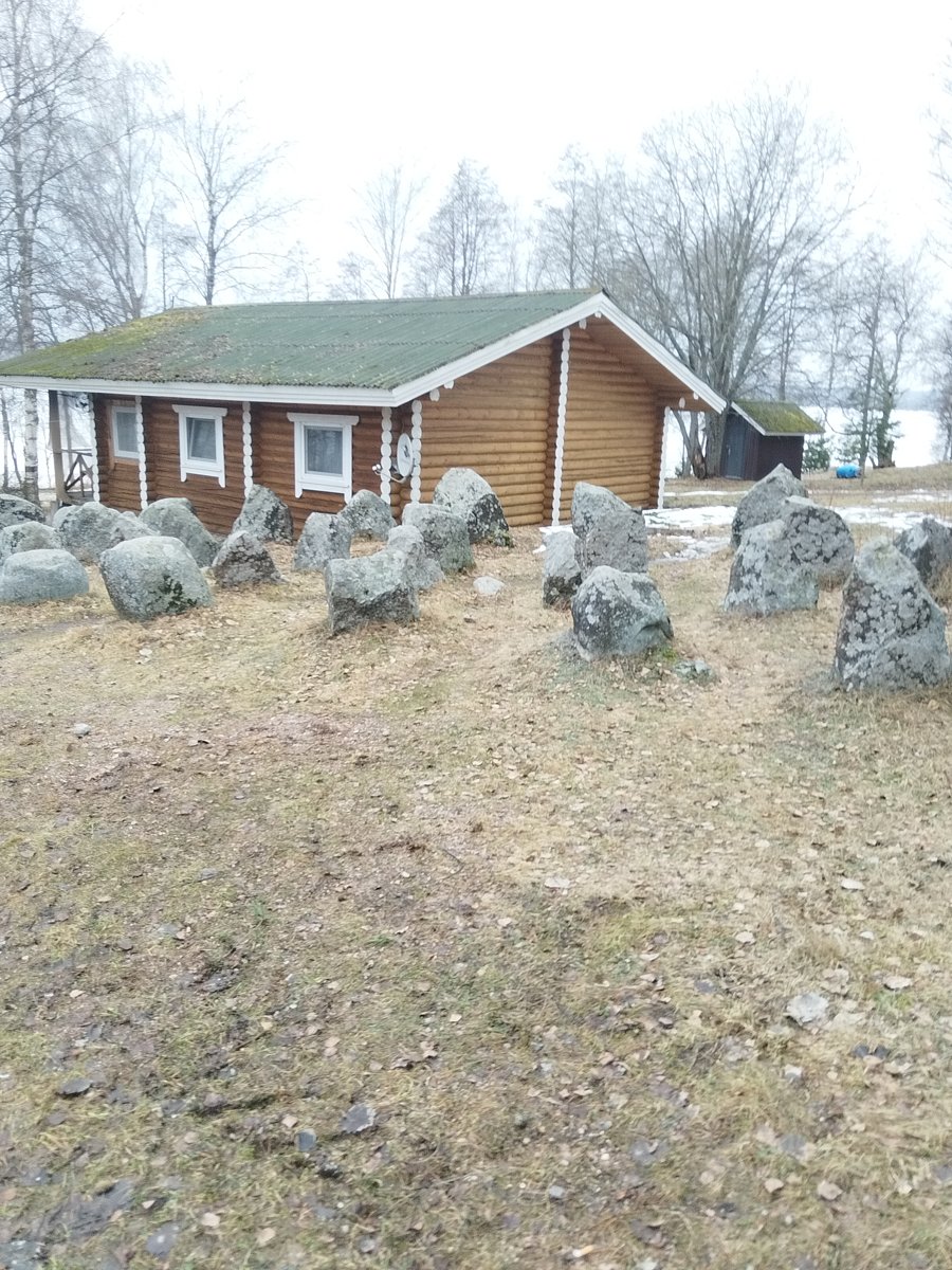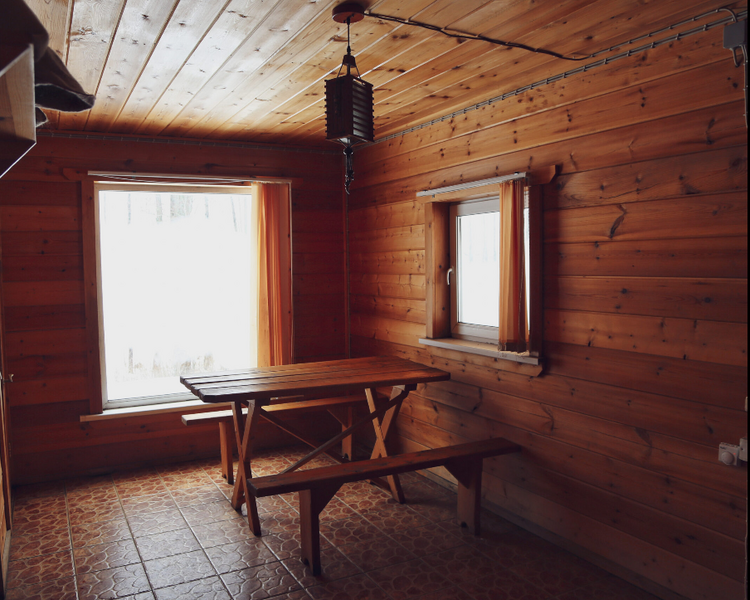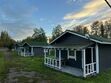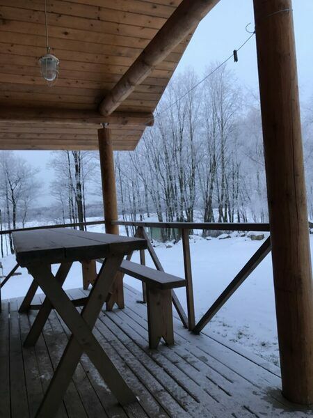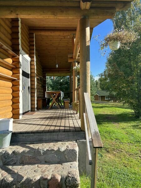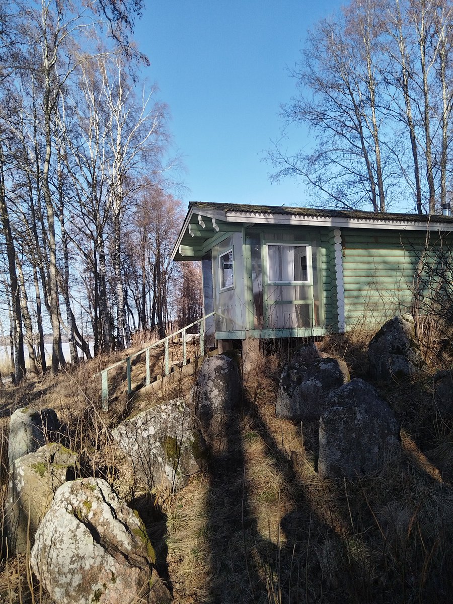 Веранда на крыльце, вход по ступенькам. Три изолированные спальни, диван в кухне-гостиной, теплый пол. Рядом маленькая баня и вид на озеро.