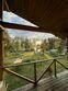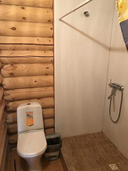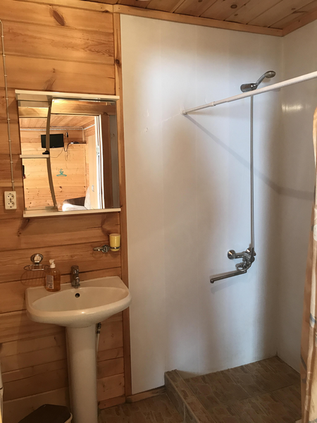 Вход по ступенькам, возле дома пара беседок. Две изолированные спальни, в одной - одна двуспальная кровать, в другой - две двуспальные кровати и диван в кухне-гостиной, душ и туалет .