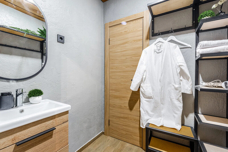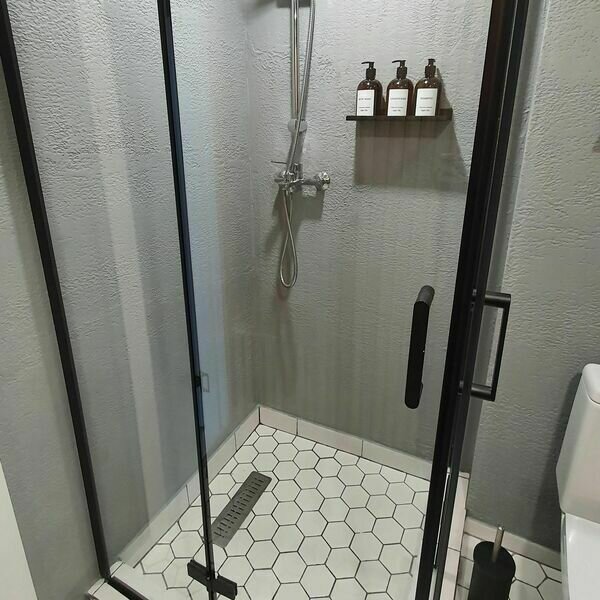 В санузле есть шампунь, кондиционер, гель для душа, крем для рук, жидкое мыло, освежитель воздуха, женские гигиенические принадлежности, ватные палочки и диски. Фен очень мощный. Есть принудительная вентиляция, которую можно включить или выключить.