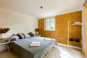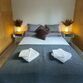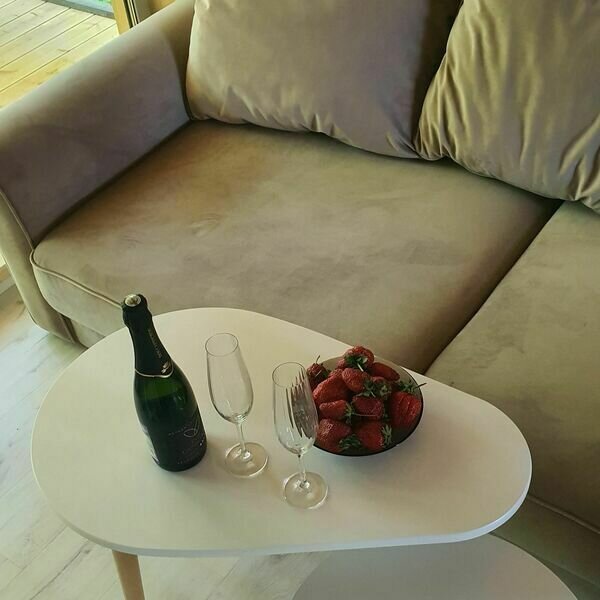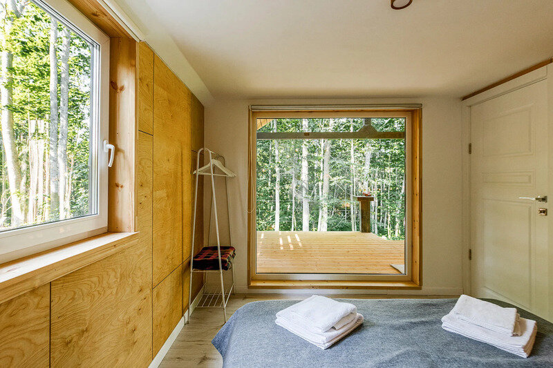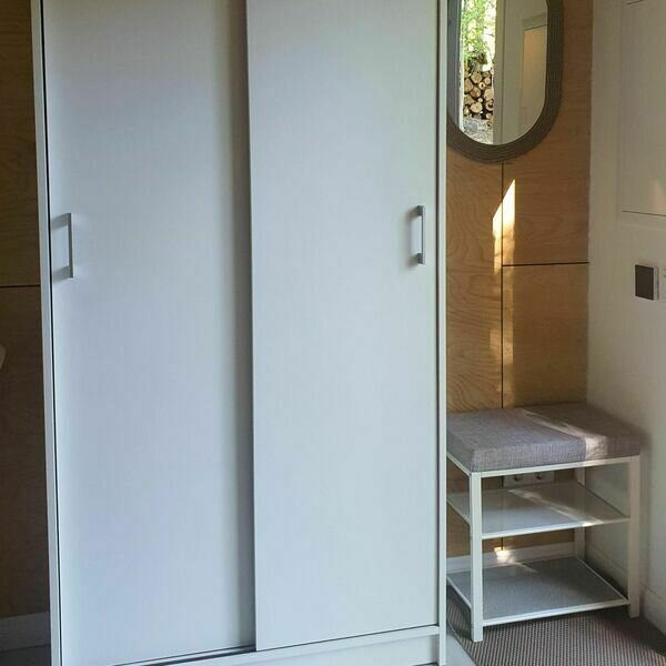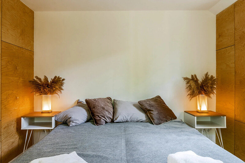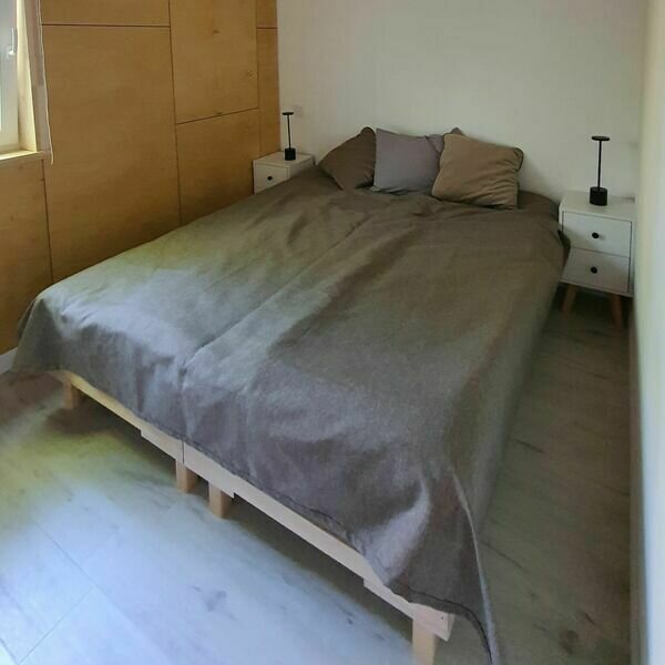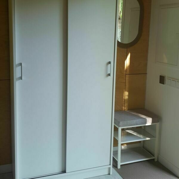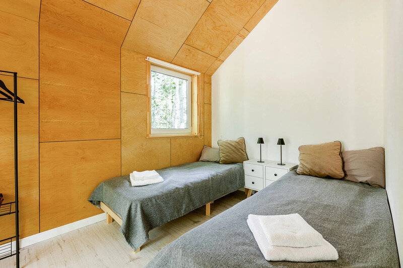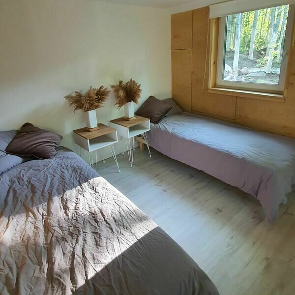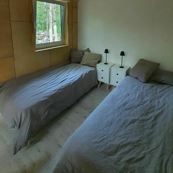 Все фото в интернете соответствуют действительности, в домике чисто, нет посторонних запахов. В одной спальне кровать двуспальная с единым двуспальным матрасом, во второй две кровати, которые могут сдвигаться, объединяемые одной простынью, но звездой посередине полежать не получится потому что матрасы разные по высоте. На окнах есть плотные шторы (рулонные или обычные).