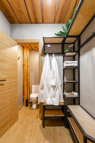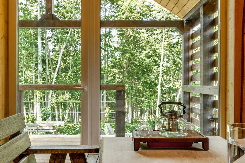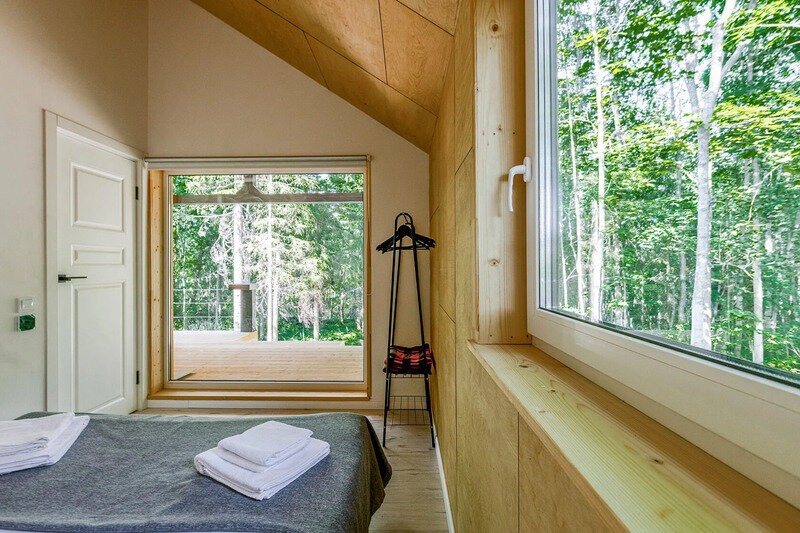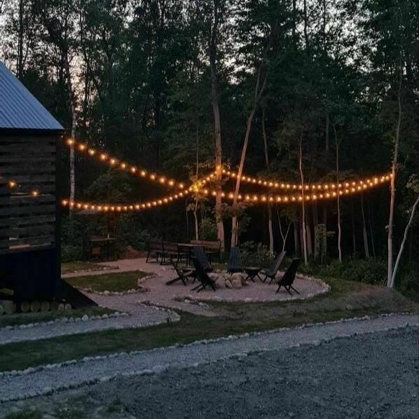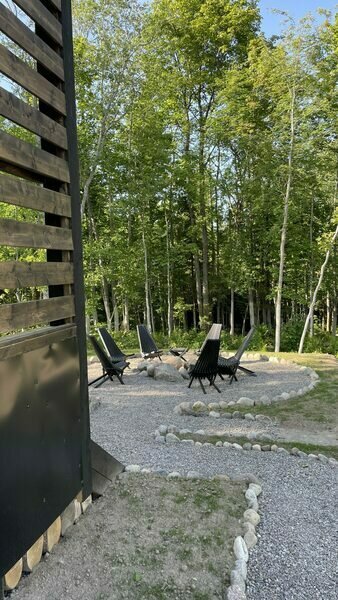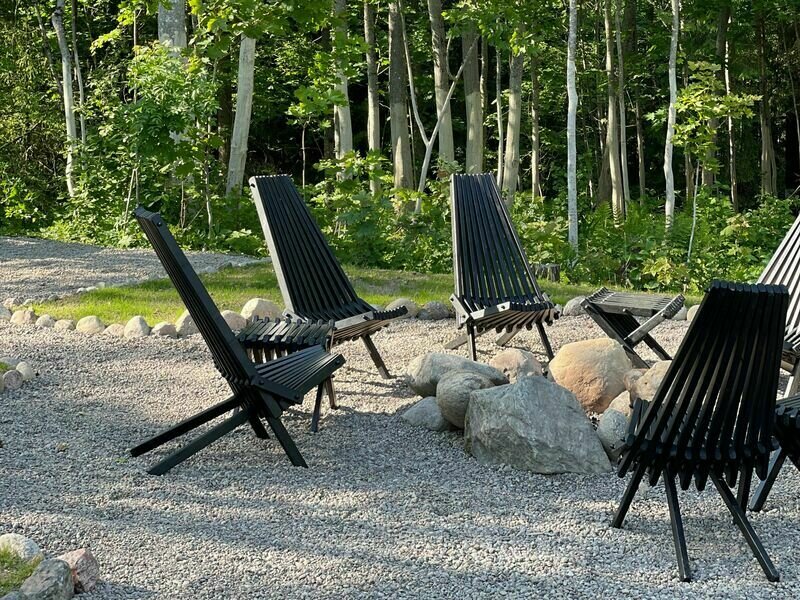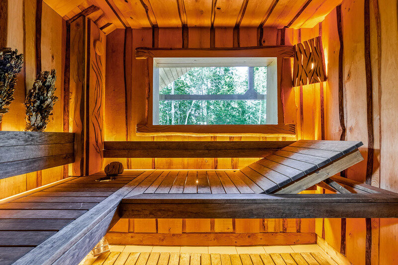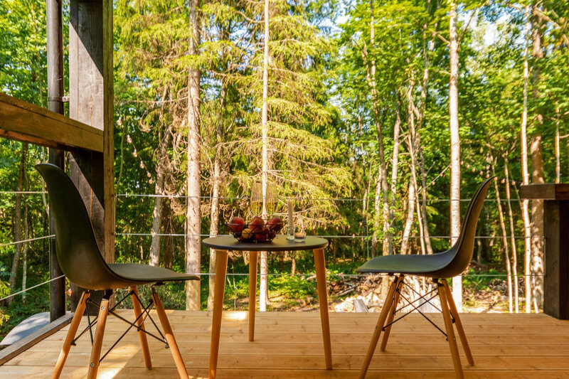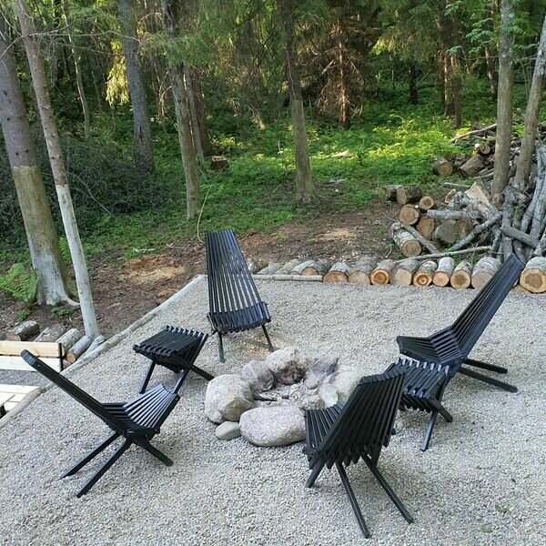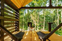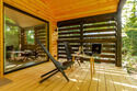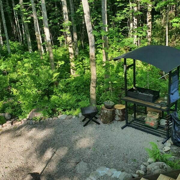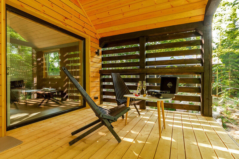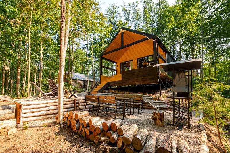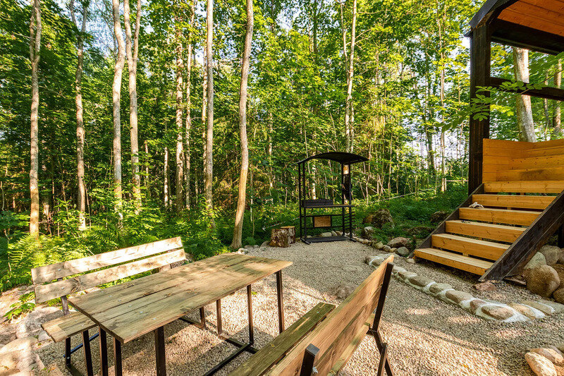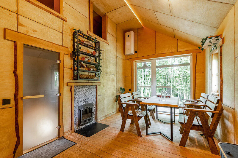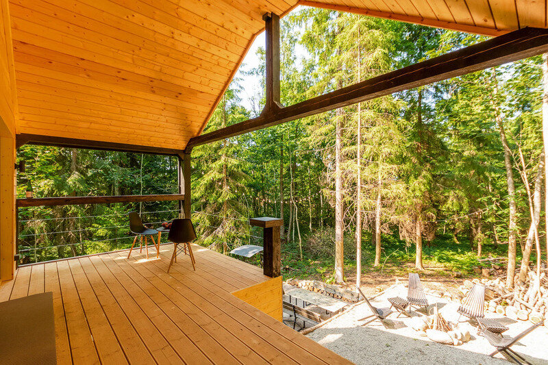 У каждого дома — большая крытая терраса с потрясающим видом на лес, а также зона с мангалом и место отдыха у костра с креслами и теплыми пледами. На базе также есть баня, которую можно арендовать даже без проживания в домах.