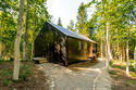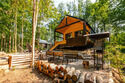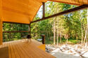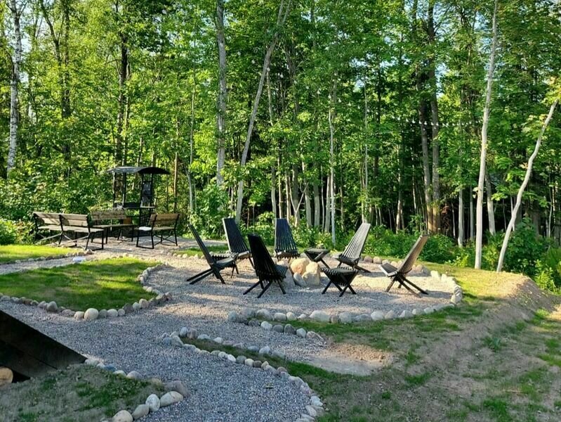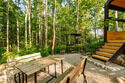 Дом расположен в окружении высоких деревьев. Из панорамных окон открывается прекрасный вид на дикий лес. Крытая терраса 18 м2. У дома располагается костровая зона с кострищем и креслами и мангальная зона с навесом.