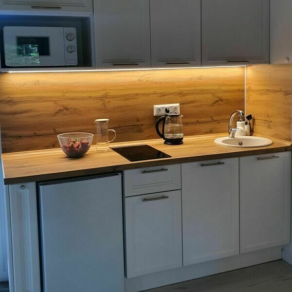 На кухне есть всё необходимое, в том числе соль, перец, оливковое масло, сахар тростниковый, молотый кофе для рожковой кофемашины.