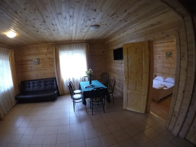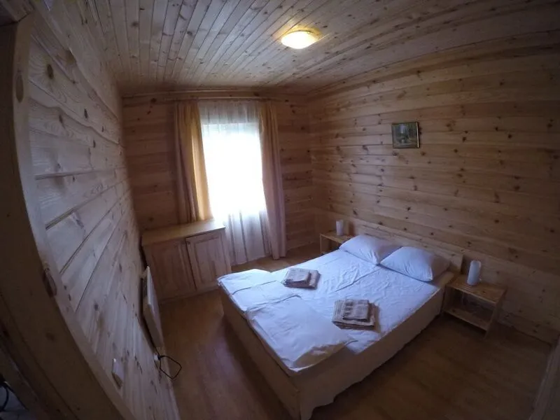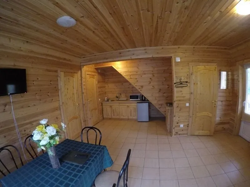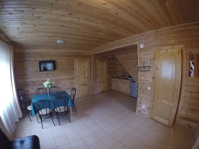 1 этаж – просторный холл с мягкой мебелью, обеденным столом, спутниковым телевидением, оборудованная кухня (плита, холодильник, вся необходимая кухонная и столовая посуда), спальня с двуспальной кроватью либо двумя раздельными кроватями, санузел с душевой кабиной, веранда с видом на озеро.