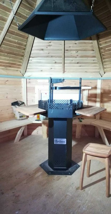 Домик, напоминающий игрушечную избушку, создан для посиделок с друзьями за общением, согреванием в прохладную погоду и готовки еды (мясной шашлык, рыба, овощи) на огне с пылу с жару.