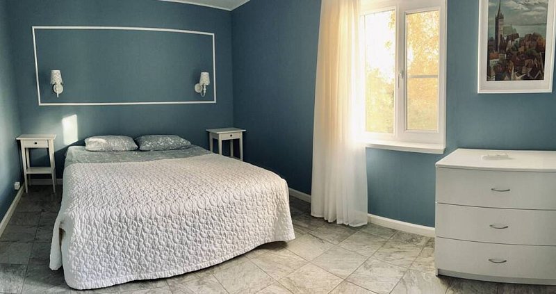 В доме 4 спальни и зал с диваном. Комфортно можно разместить в комнатах до 11 человек, максимально 13 человек. (8+5). Наличие в спальнях туалета и душа. Всего в доме 3 санузла. Небольшая Сауна на 2-3 человека включена в стоимость проживания. Большой зал с диваном, столом и кухня со всем необходимым оборудованием, утварью и расходными материалами.
