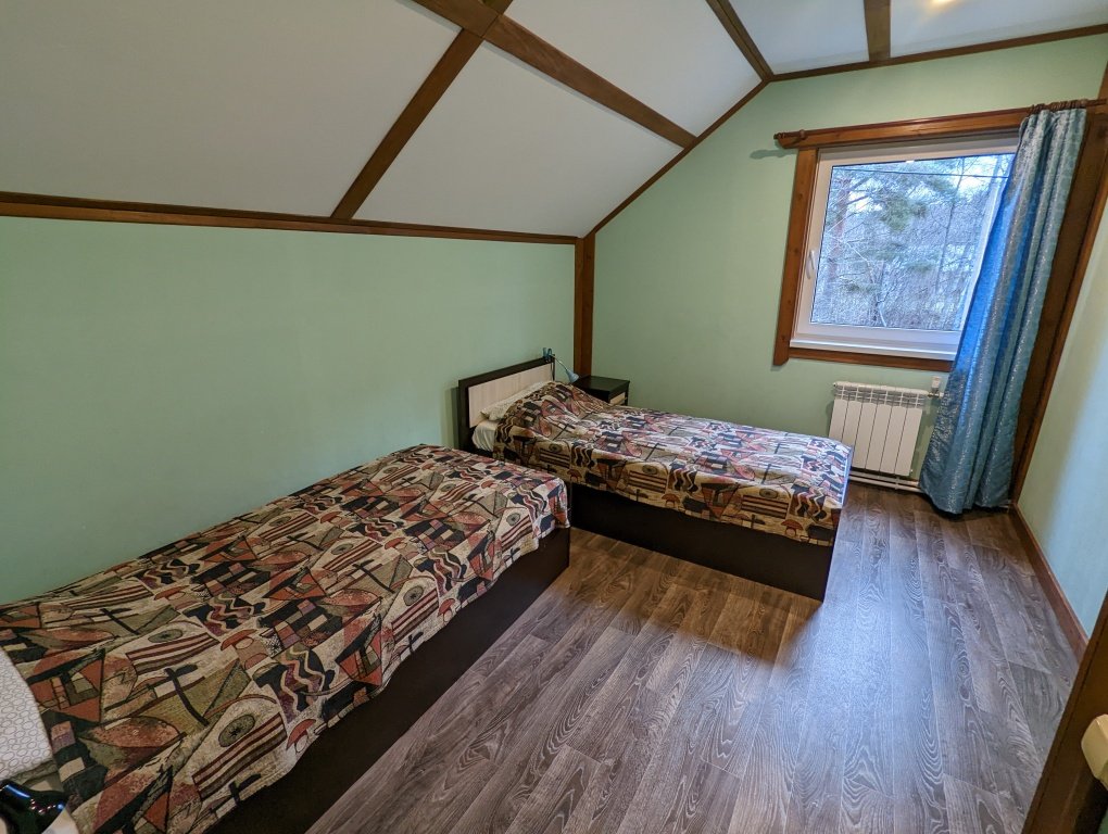 В коттедже – две спальные комнаты (в одной – двуспальная кровать, в другой – две односпальные кровати), большая гостиная с двуспальным диваном, полностью оснащенная кухня и два санузла.