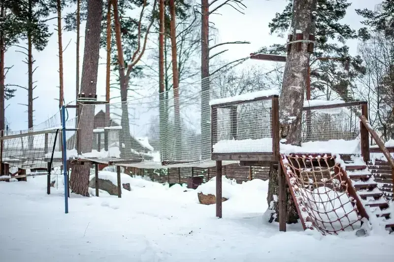 Веревочный городок находится на небольшой высоте и оборудован страховочной сеткой.