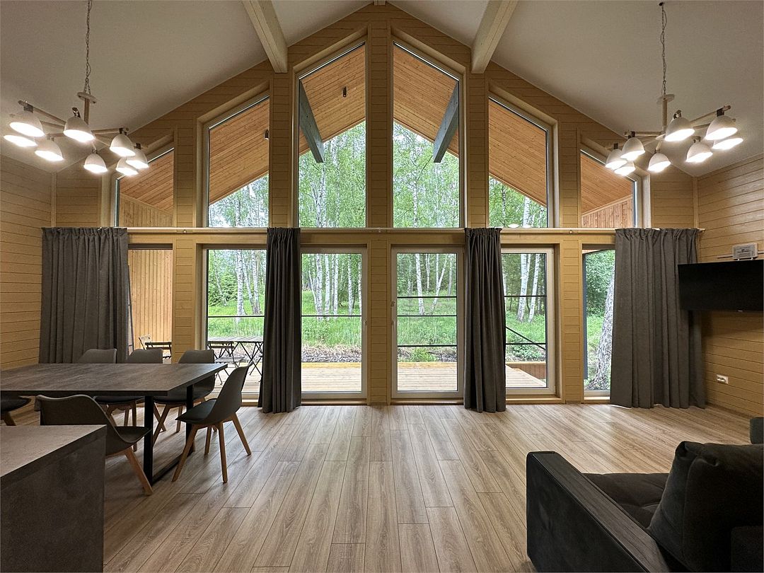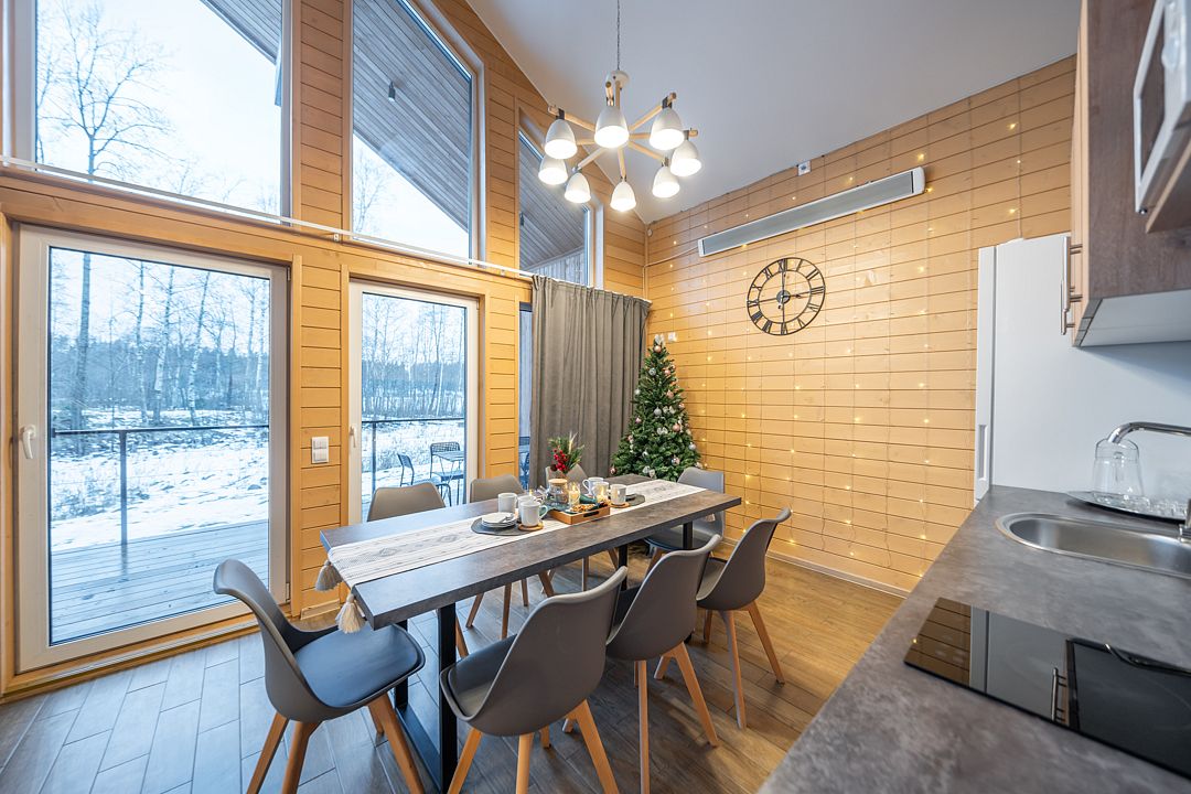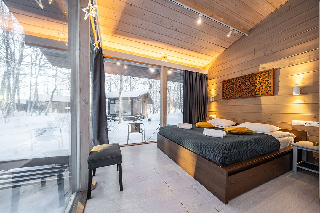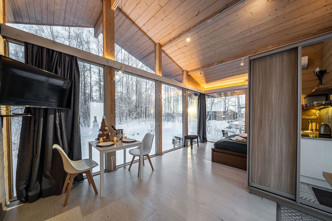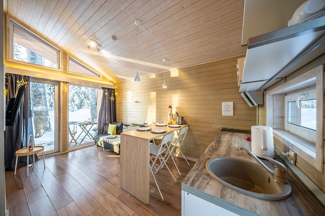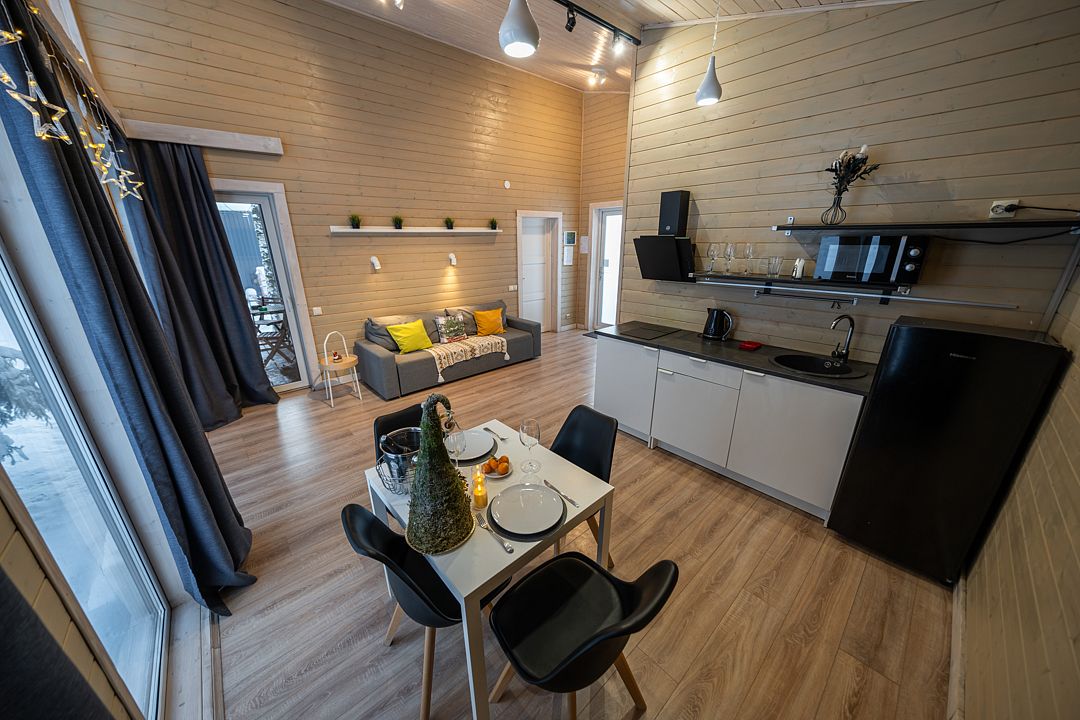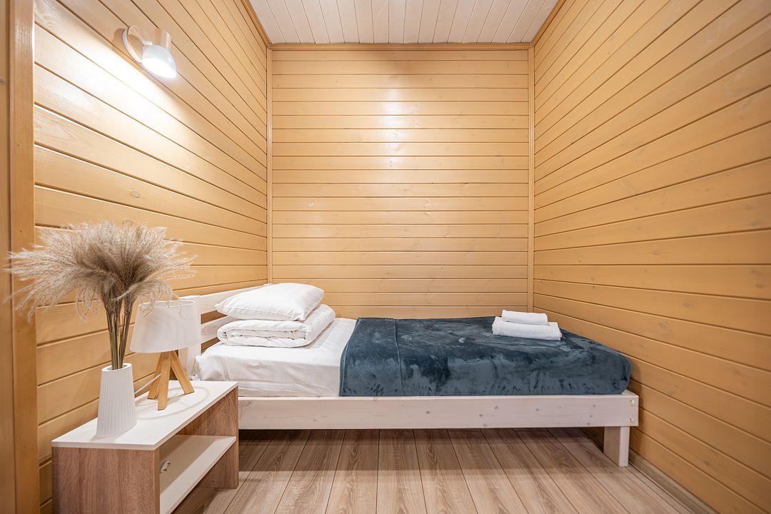 На мини-кухне можно приготовить вкусные закуски, а потом выйти на пирс и насладиться свежим воздухом. Вода в озере зовет вас на плавание, а окружающая природа создаёт атмосферу спокойствия и уюта.