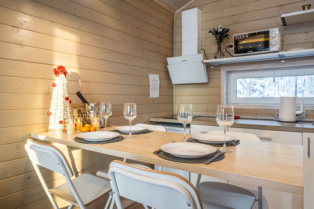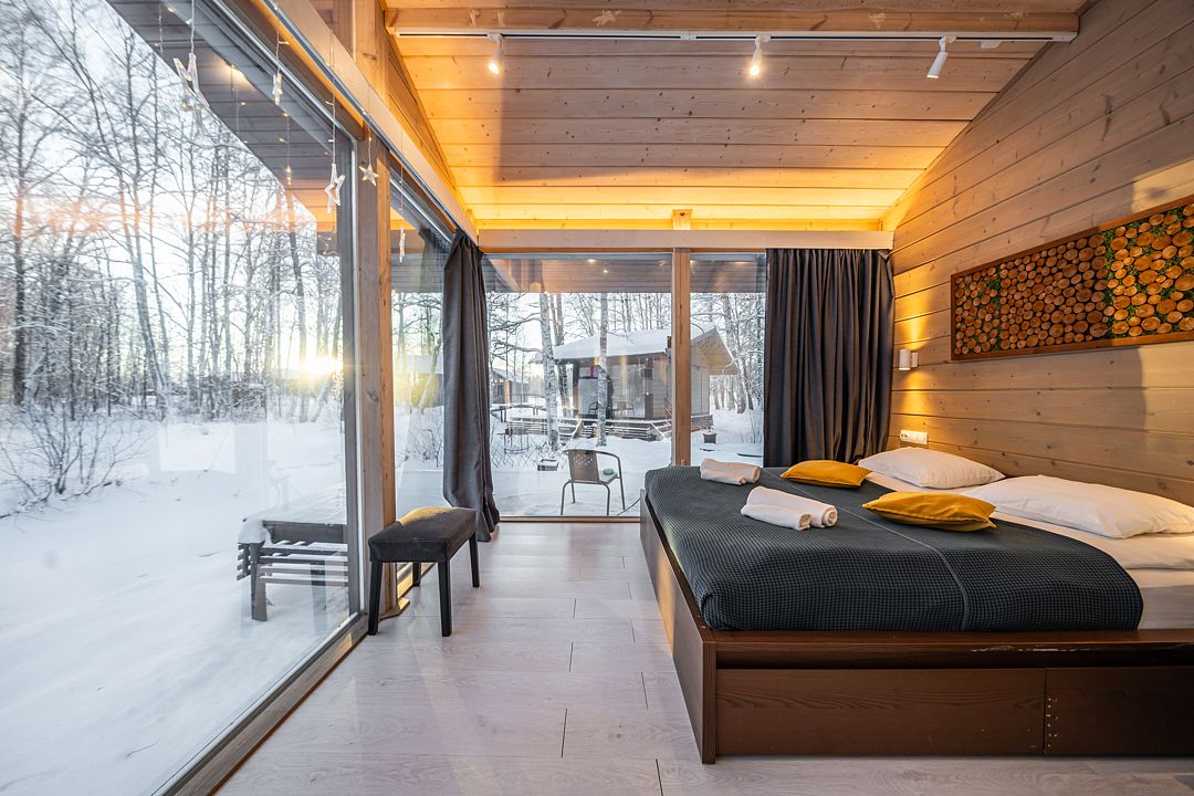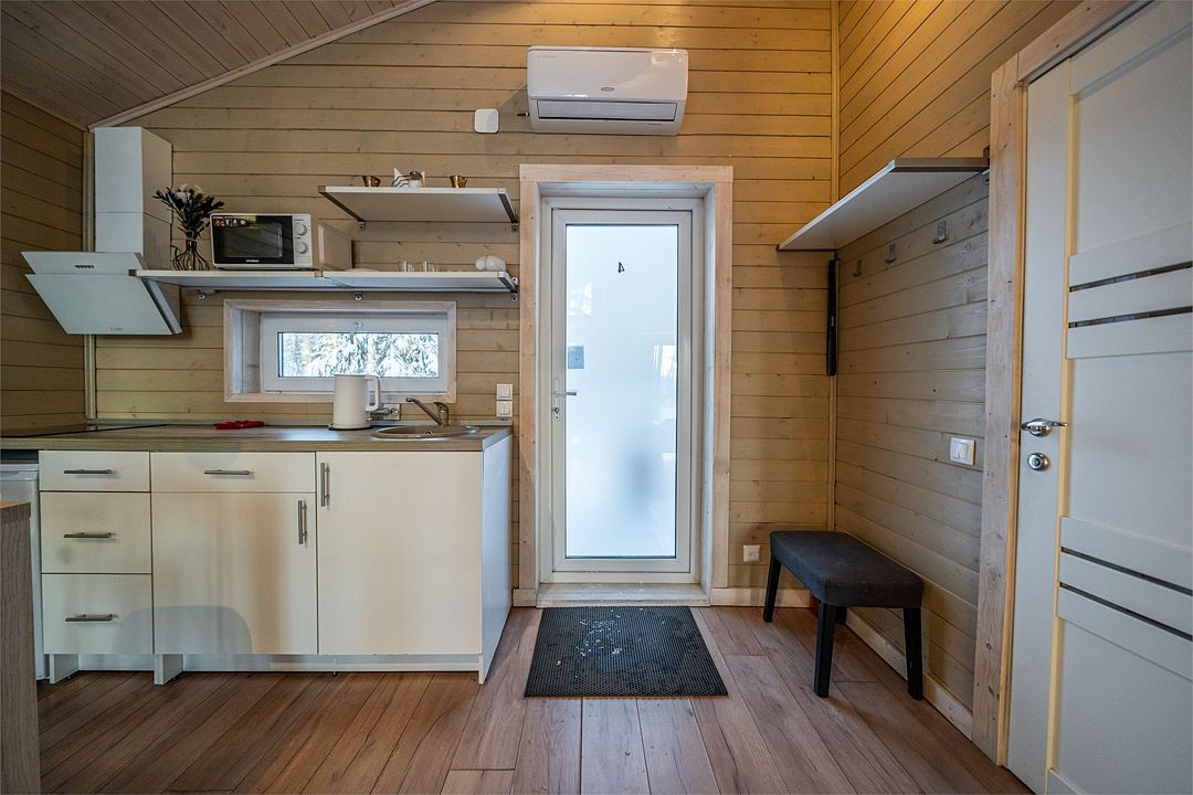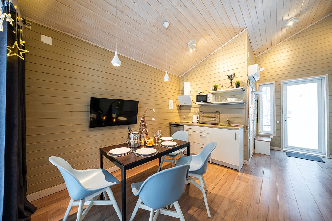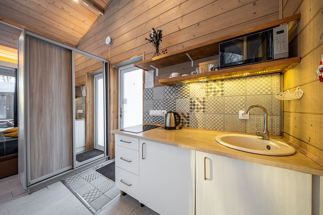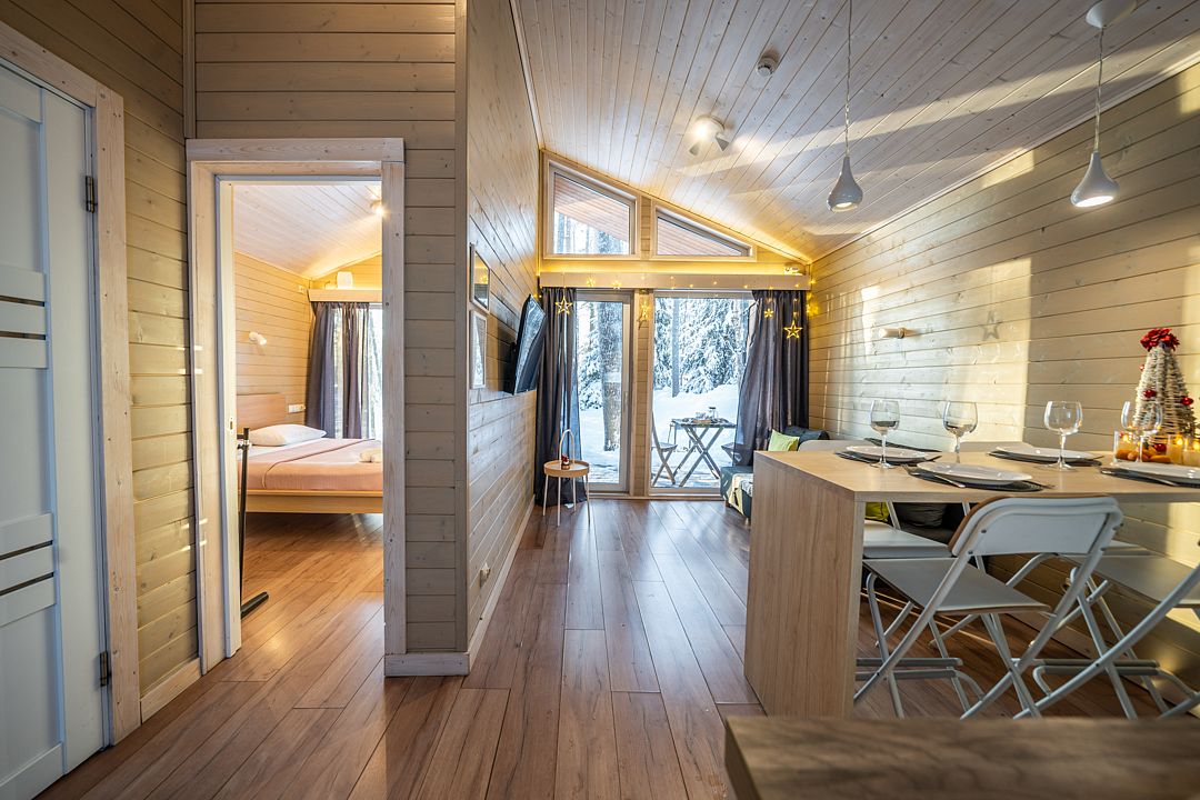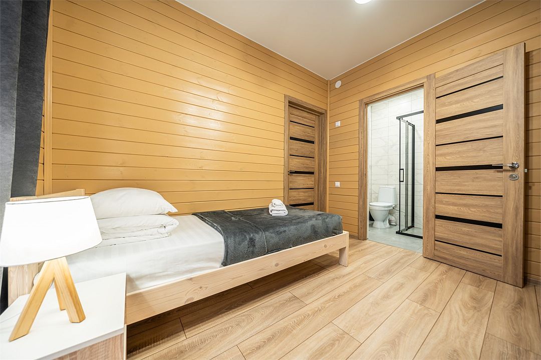 На мини-кухне можно приготовить вкусные закуски, а потом выйти на пирс и насладиться свежим воздухом. Вода в озере зовет вас на плавание, а окружающая природа создаёт атмосферу спокойствия и уюта.