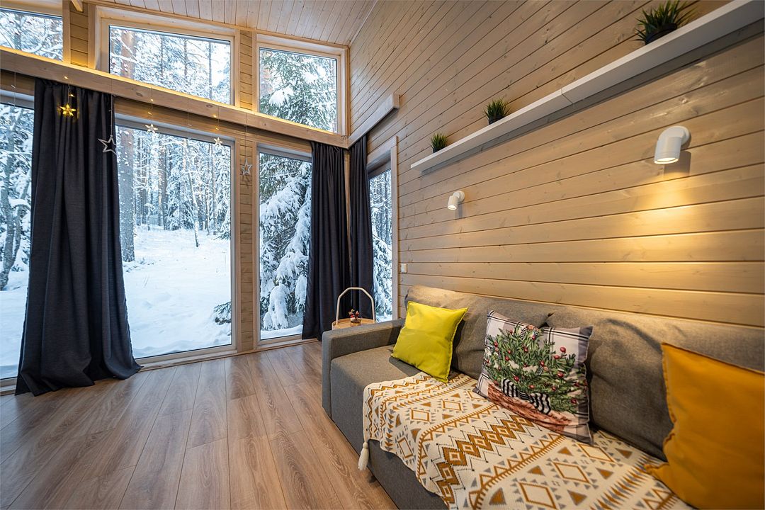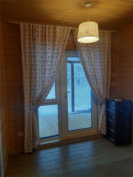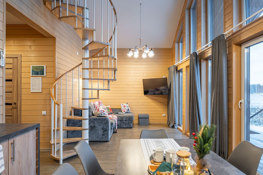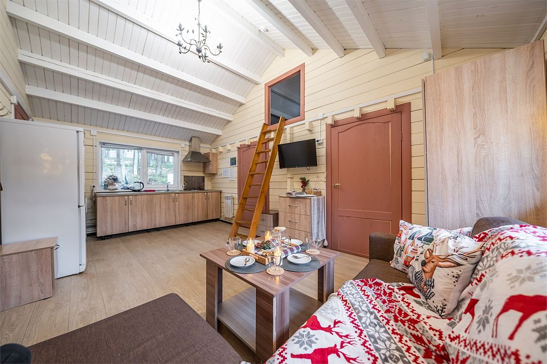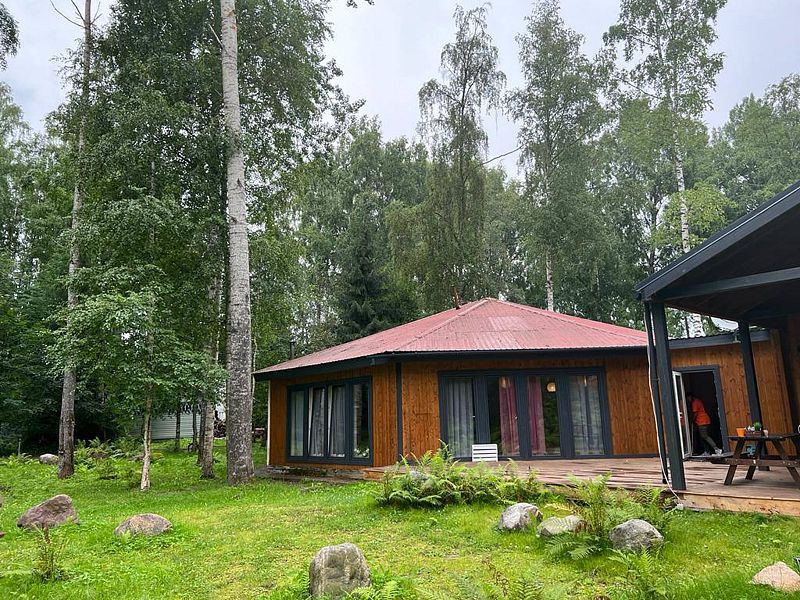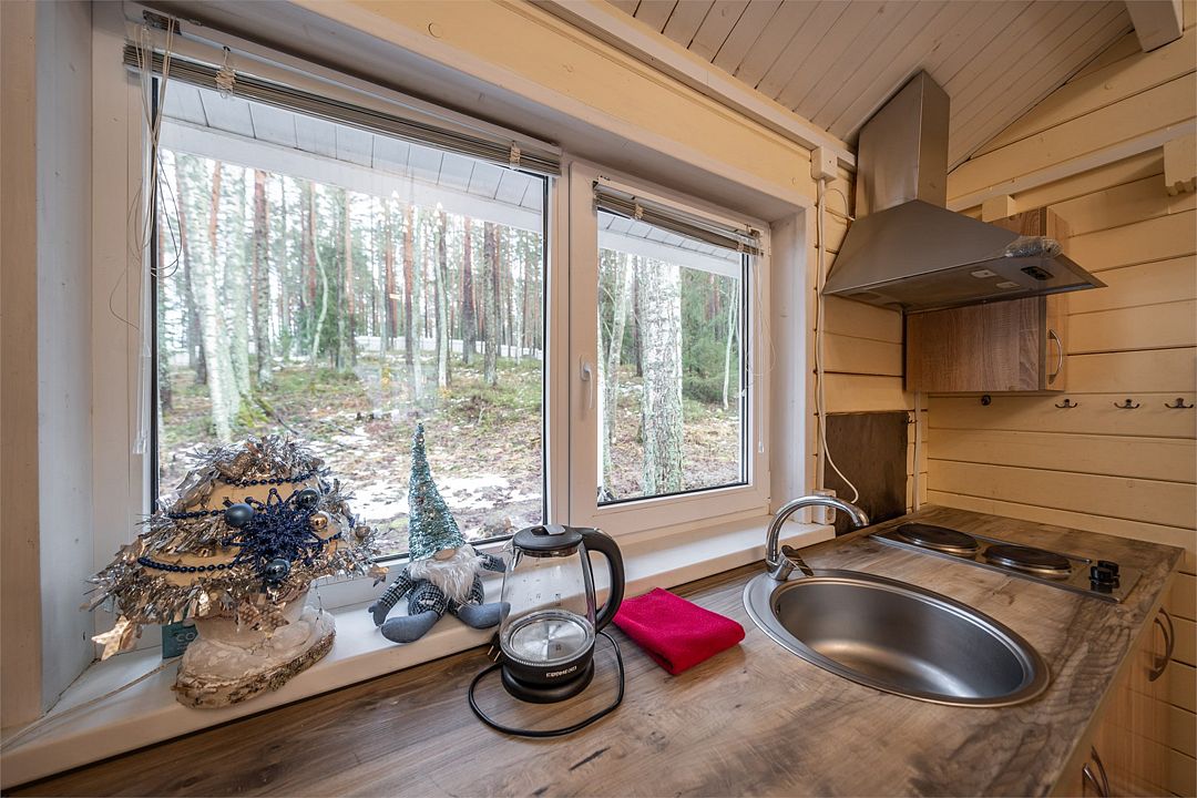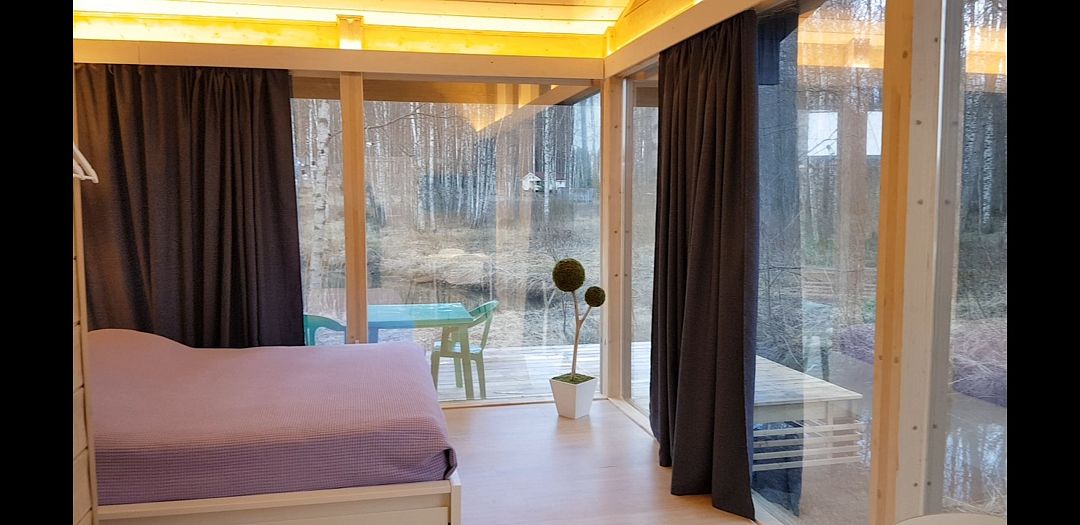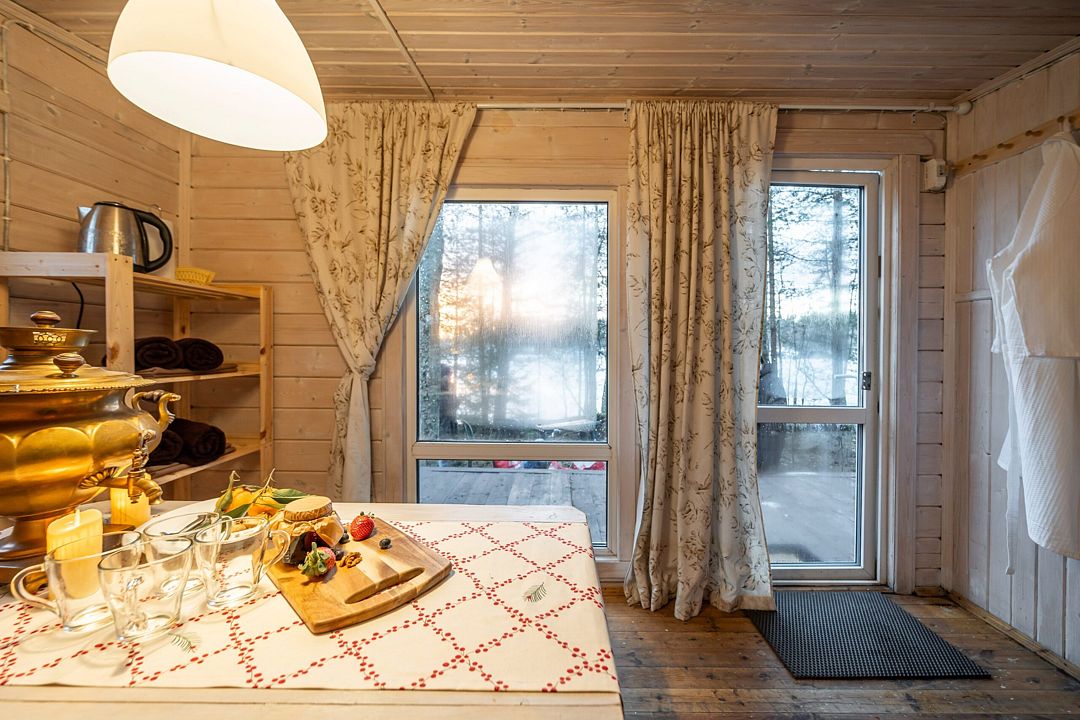 Из окон открывается прекрасный вид на о. Вуокса и лес. В 300 м находится уединенный пляж, где можно половить рыбу, искупаться и насладиться красотой природы Карельского перешейка. В интерьере домика гармонично сочетается простота с натуральными материалами в декоре.